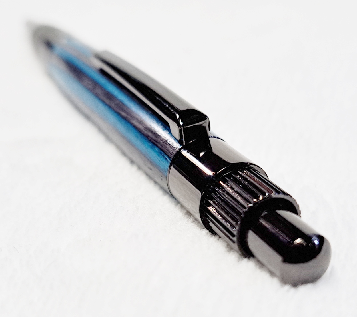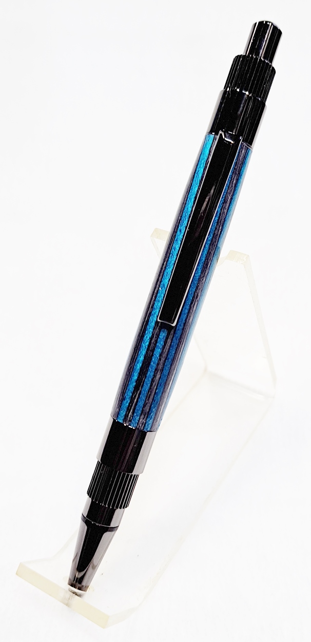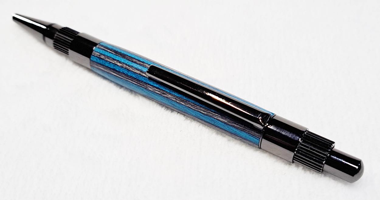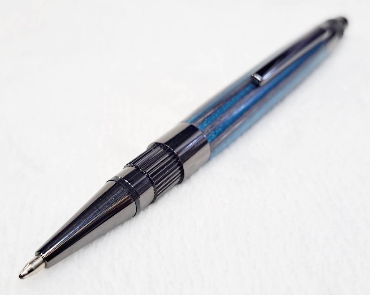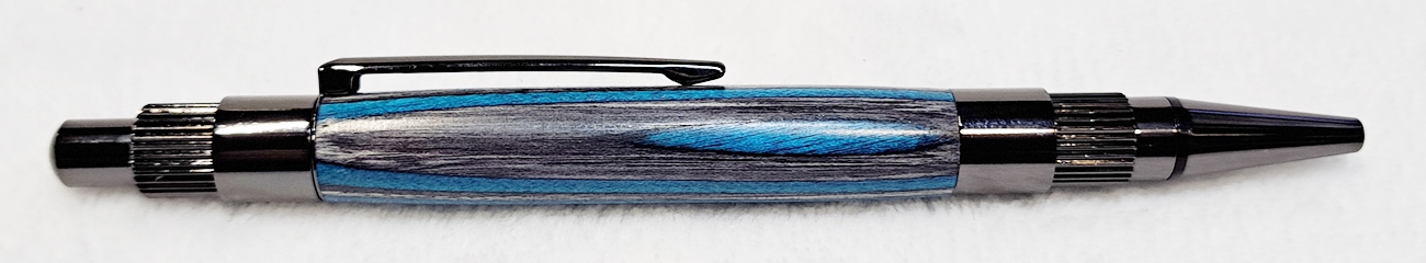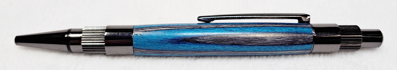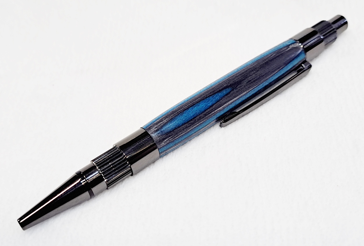 This is a Gear click pen in gunmetal, from Crooked Mill. The blank is a SpectraPly called Dark Aqua, from Woodcraft. The finish is Mylands friction polish and carnuba wax.