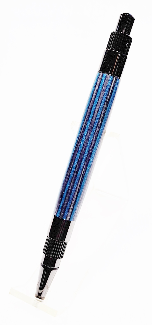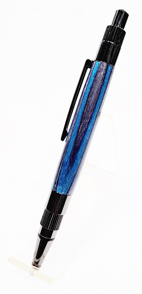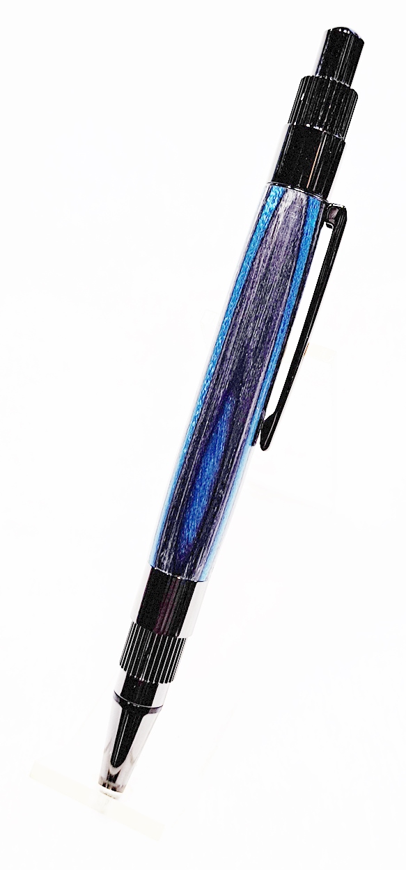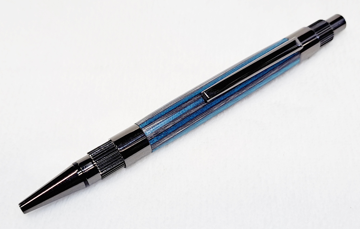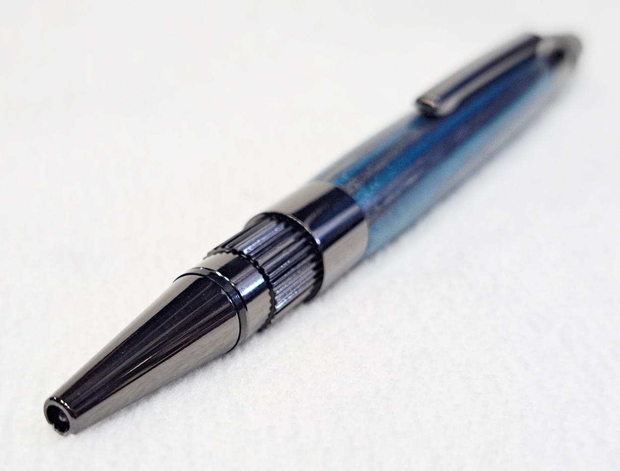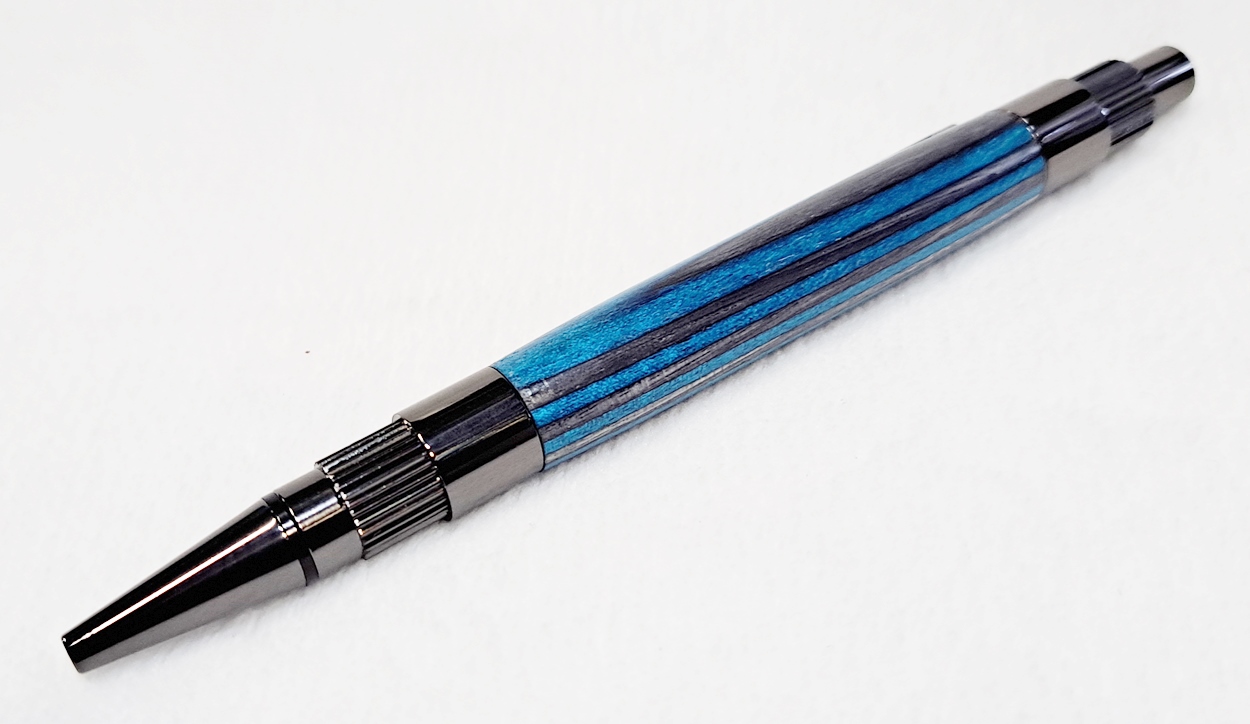 This is a Gear click pen in gunmetal, from Crooked Mill. The blank is a SpectraPly called Dark Aqua, from Woodcraft. The finish is Mylands friction polish and carnuba wax.