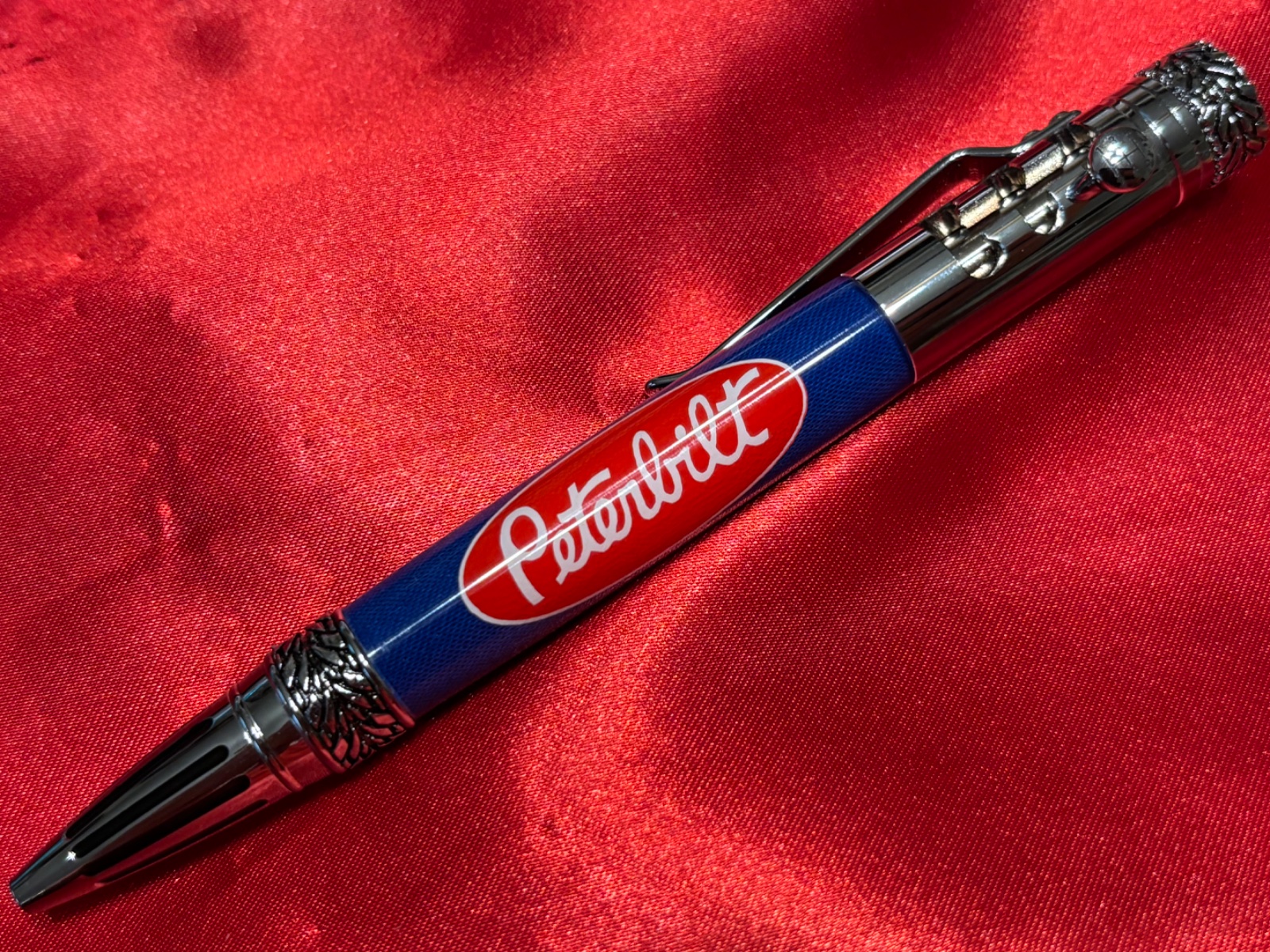 I put this together for a friend's boyfriend who owns and drives a truck for a living. A quick shout out for Exotic Blanks. The only downside to EB's are the M&Ms. I need to loose some weight and I can't throw things away even though it's not good for me. I ordered the kit from them early Friday morning and received the kit on Monday. I was able to glue it up and cast it early this week and turned it today. It's a cloth background with a vinyl logo. The blue is the color of his truck. Questions and Comments are always Welcome.