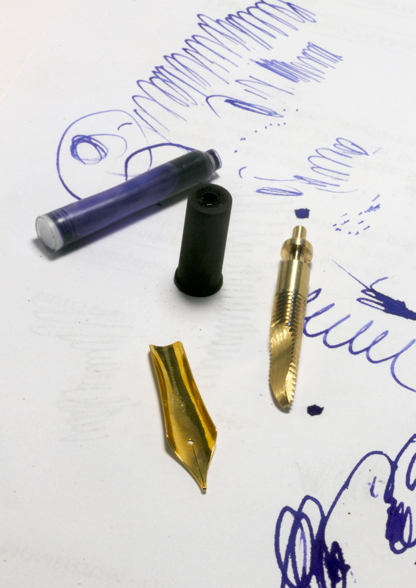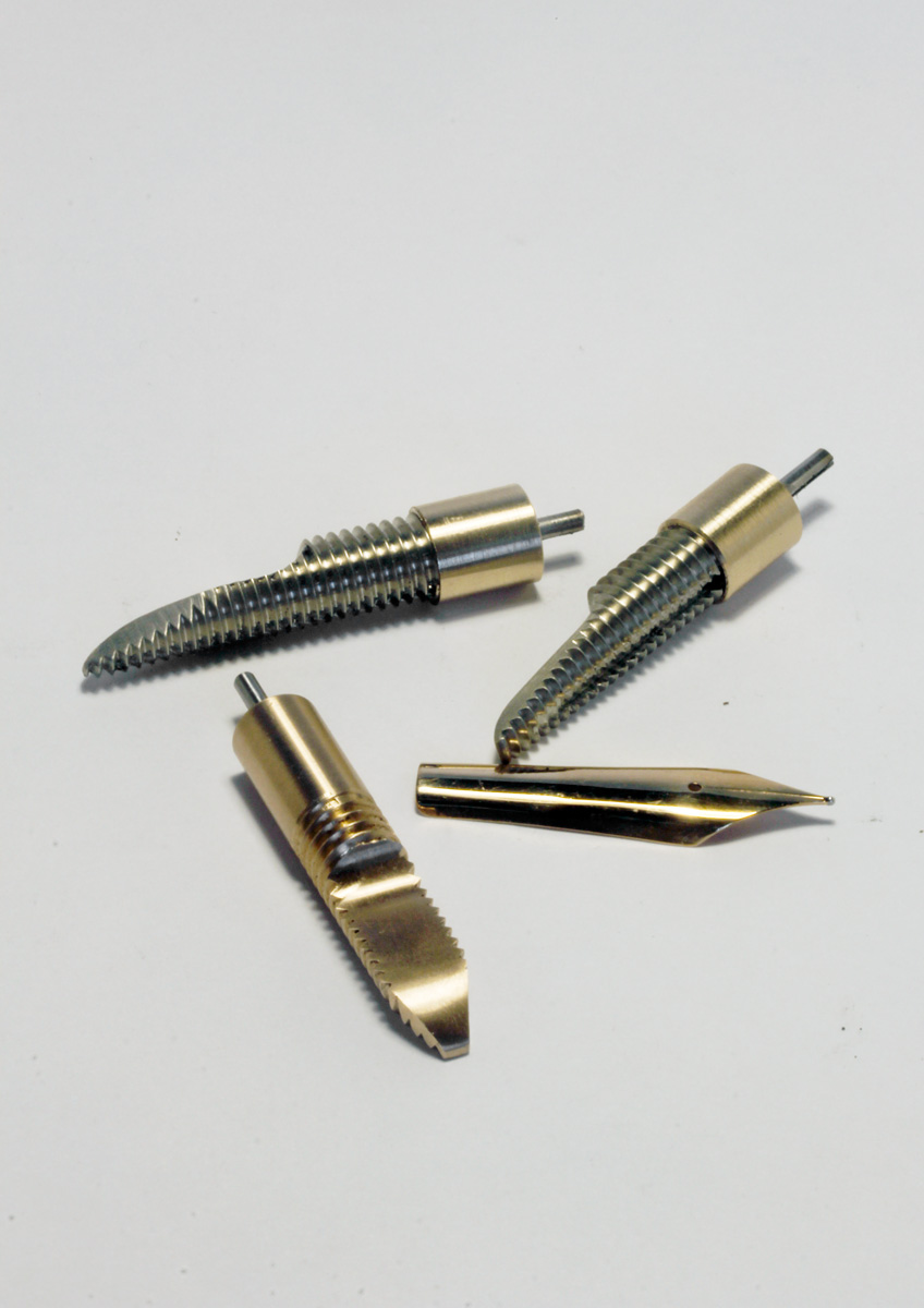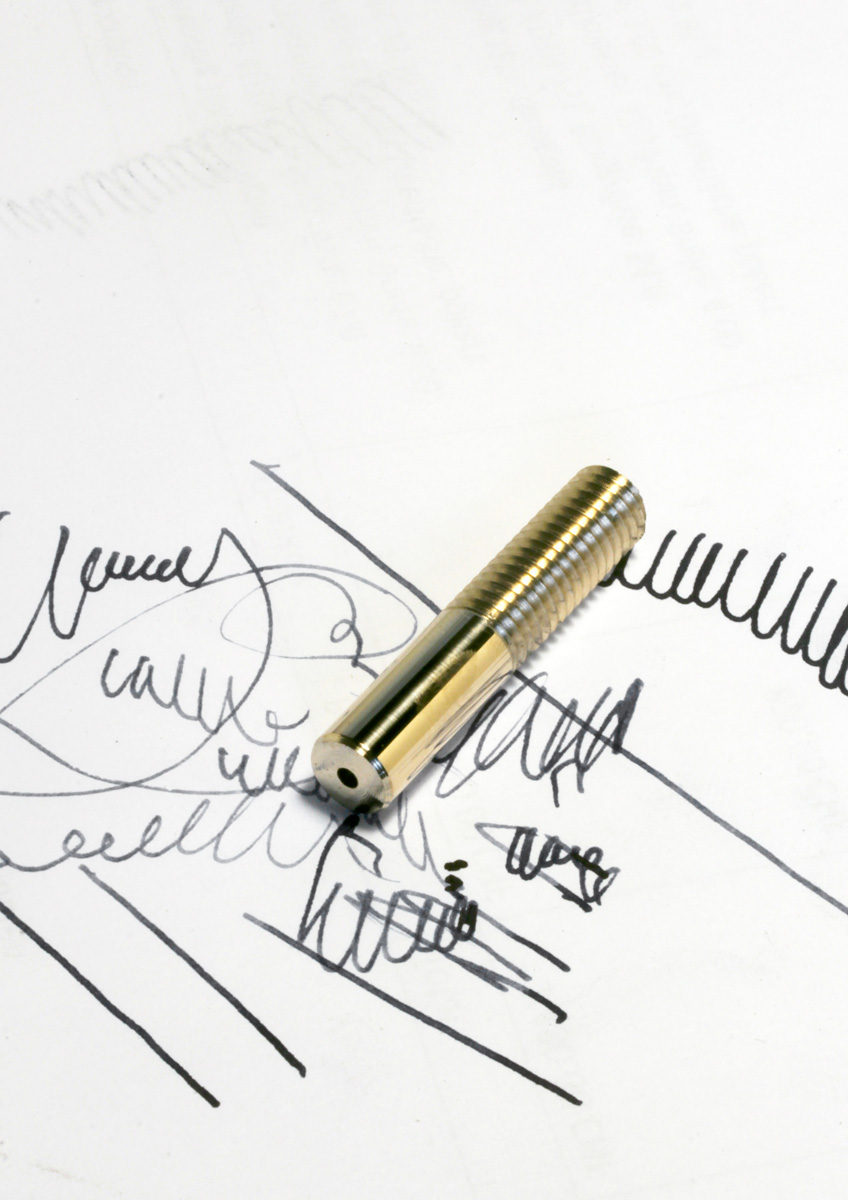 Since a long time, I am thinking and experimenting around to find a possible simple solution for ink feeds. Over the weekend I had the "divine inspiration" just to use a simple screw. The first feed was made from an 8 mm brass screw. Some adaptions were made on my Hauser 2BH high precision coordinates drilling machine. And Ha! – it works, great ink flow. The final idea is to have stainless steel feeds. The extra weight of a metal feed makes writing smoother I find