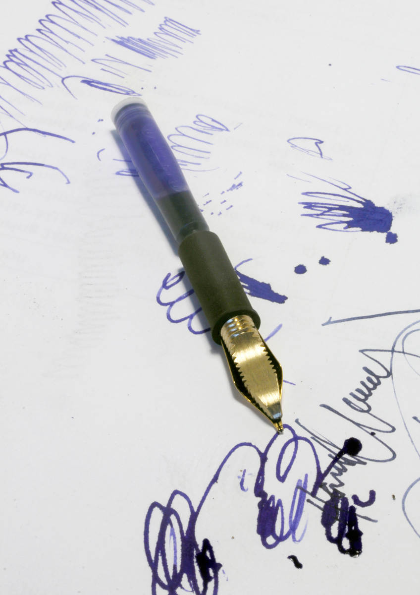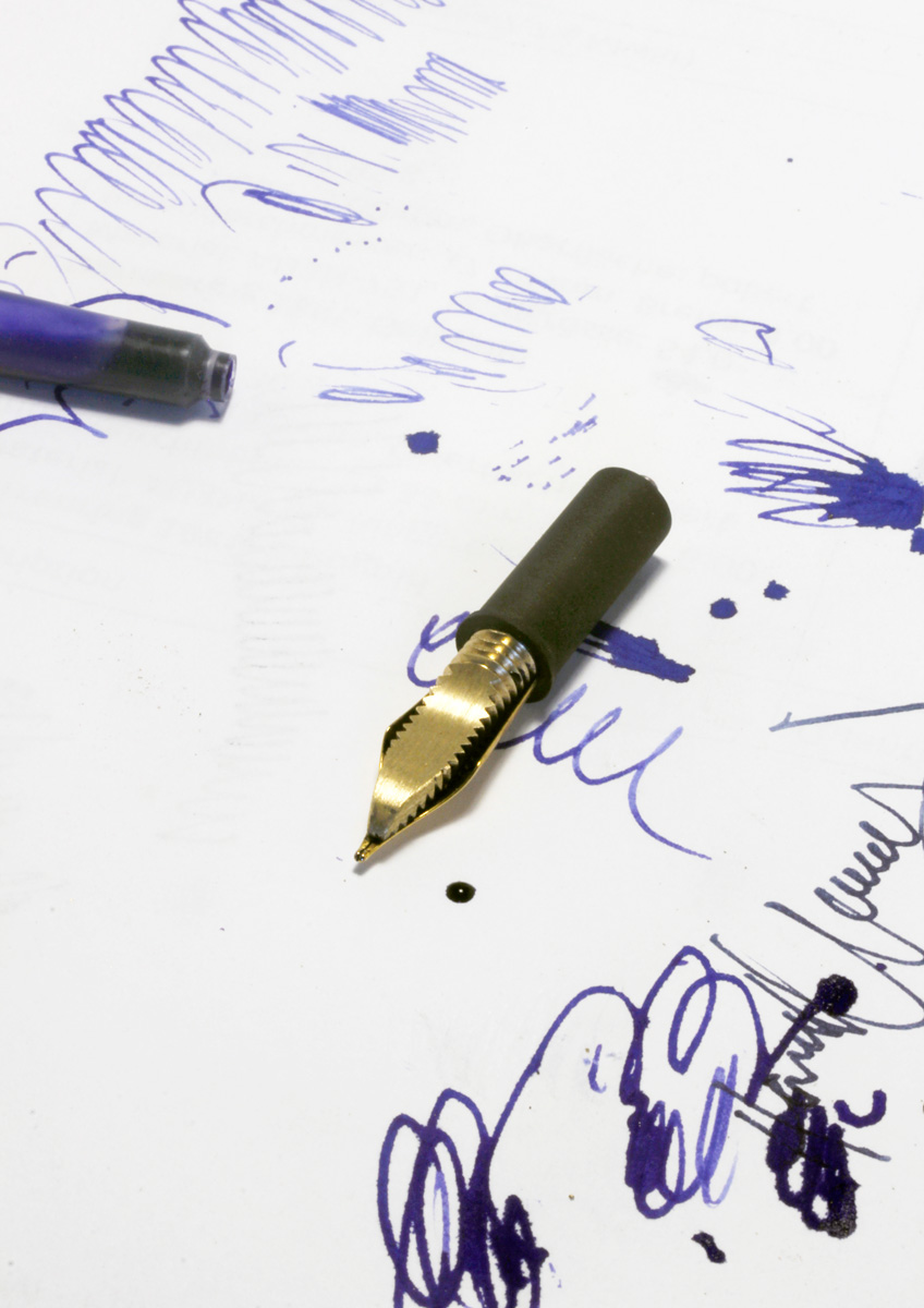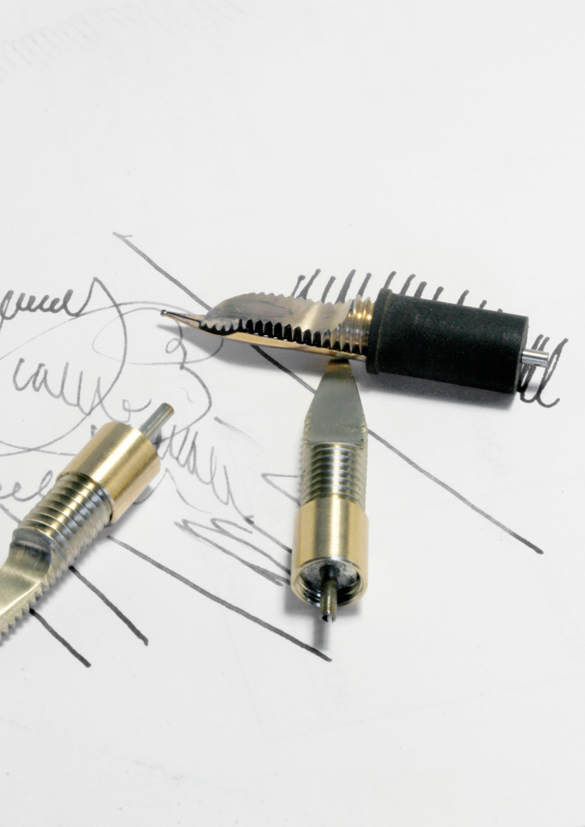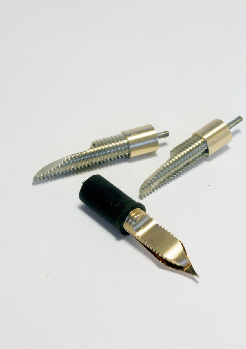 Since a long time, I am thinking and experimenting around to find a possible simple solution for ink feeds. Over the weekend I had the "divine inspiration" just to use a simple screw. The first feed was made from an 8 mm brass screw. Some adaptions were made on my Hauser 2BH high precision coordinates drilling machine. And Ha! – it works, great ink flow. The final idea is to have stainless steel feeds. The extra weight of a metal feed makes writing smoother I find
