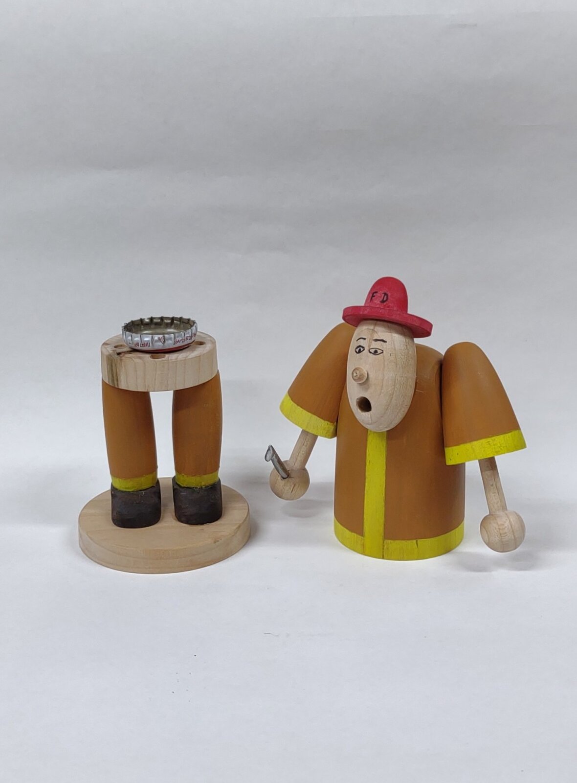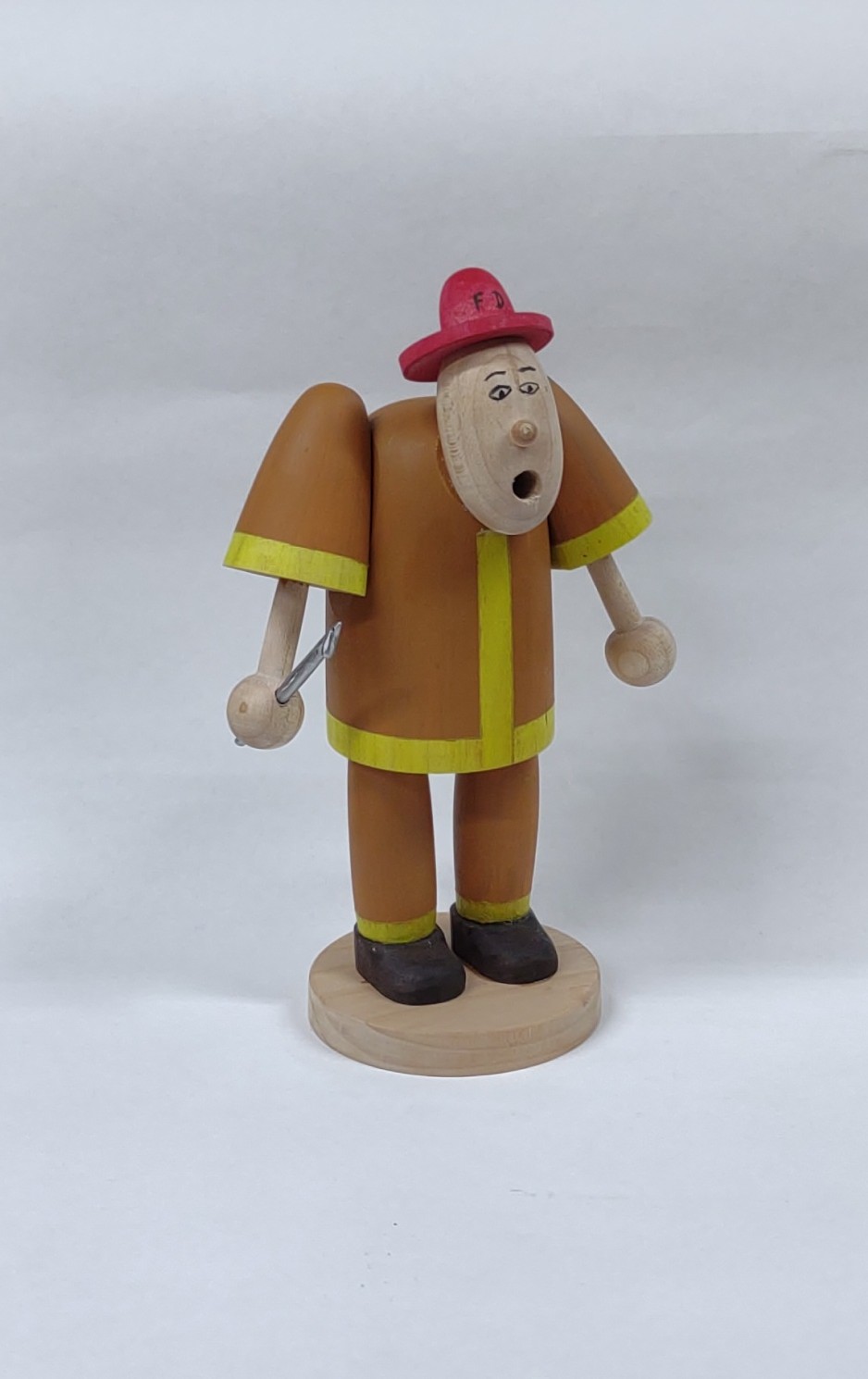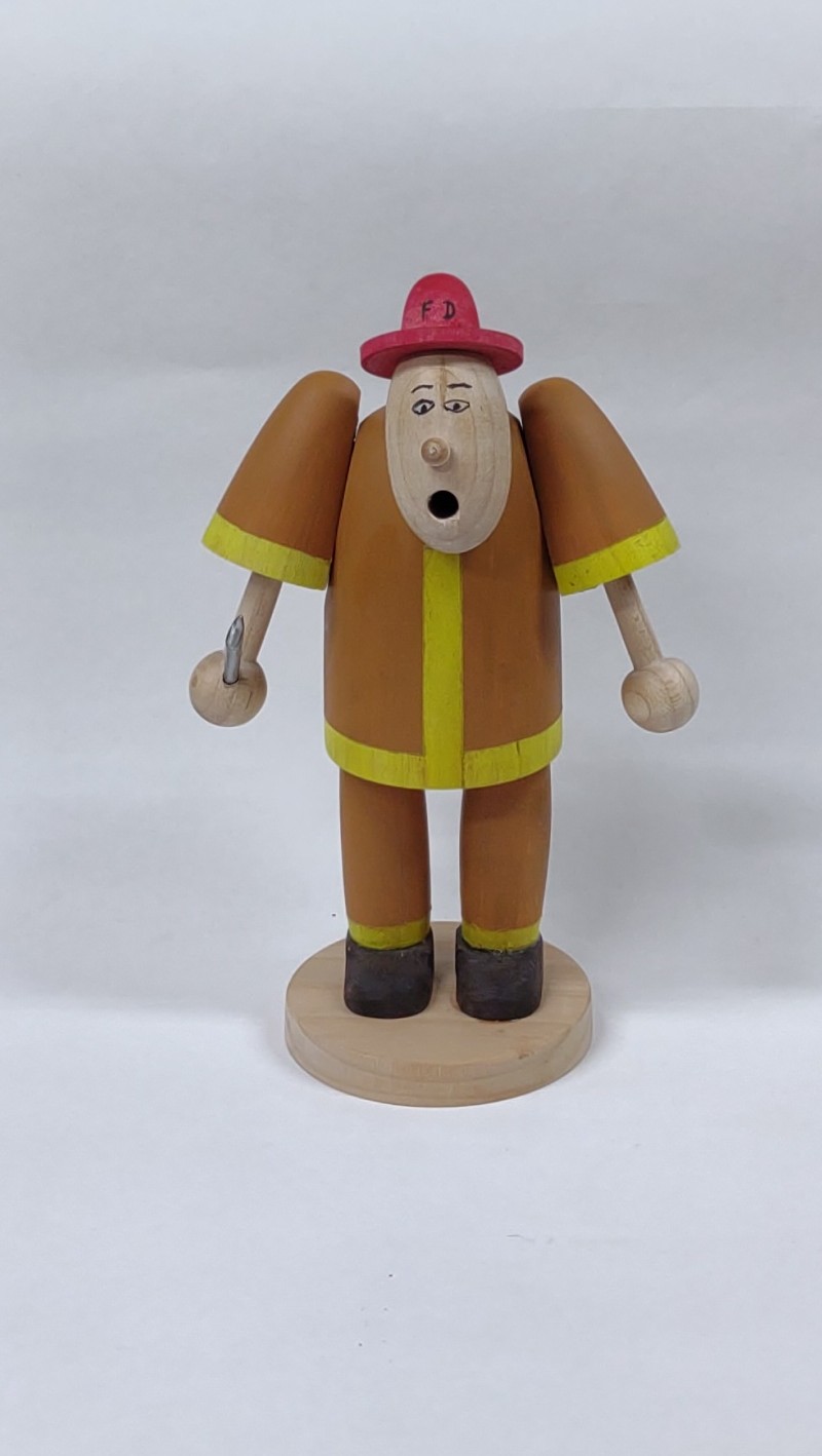 One of the demos I attended at SWAT was on German Smoking Figures by Colwin Way. They are used to burn incense in and the smoke comes out the mouth. Naturally, I had to try to make one and since today is my sons birthday, I did a Fireman theme smoker for his desk at headquarters. First attempt came out pretty good, just need to get my steps down to cut down on the amount of time to make one. Will definitely be making more of these, the possibilities for themes are endless. The wood is Maple and African Blackwood for the shoes and the pole hook is a square cut nail that I filed and a Dremel with grinding stone to shape it. It stands about 7'' tall and ~4 wide.