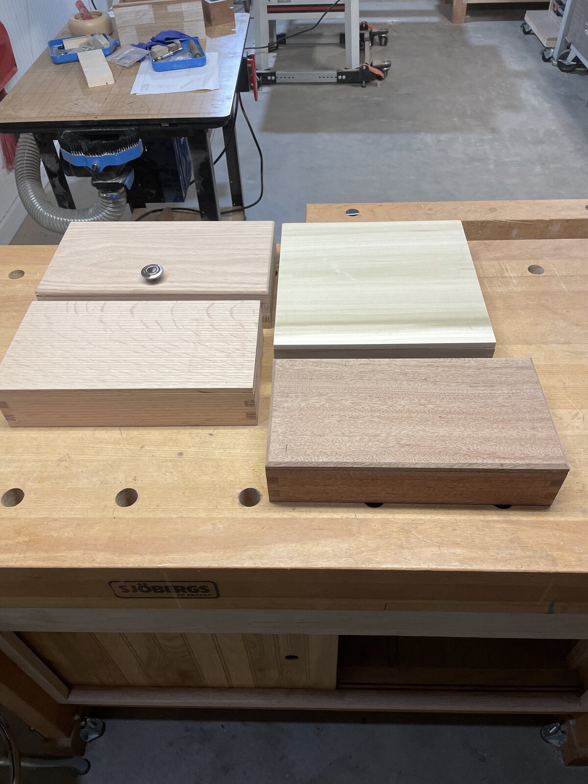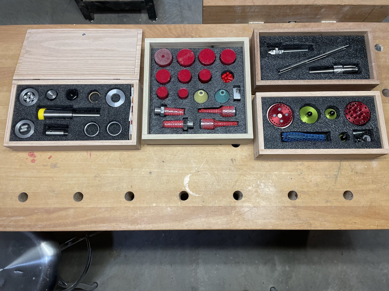 I'm on an organization kick. One I put hinges and a knob on, but decided I'd rather just have lids that set on them so I could stack them. Tools are a Beall treen mandrel set, Woodpeckers pen mandrel, stuff from Rubber Chucky and a Joyner offset jig set.