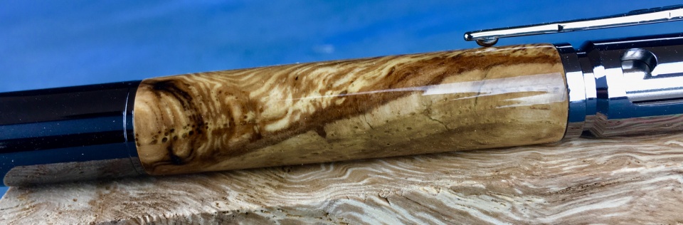 What I love about this pen so much is one half has the burl, with the other half with straighter grain. The dark strip going between those sections makes it really pop. Excellent execution!