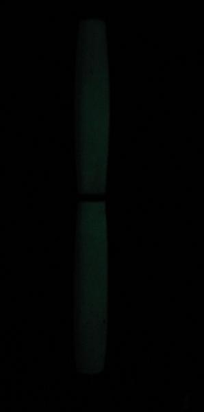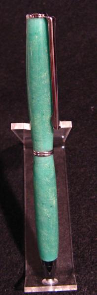 I have been playing a lot with some new chemicals and if nothing explodes I must be doing something right. I have made a photochromic blank that i was able to get to glow in the dark and it didn't explode on the lathe(first one). I'm hoping this is going to work as i get them a little more complex but for now it is an emerald green turning to gold that glows brightly in the dark. The fittings are platinum and the finish is just micromesh to 12000 and thats it.