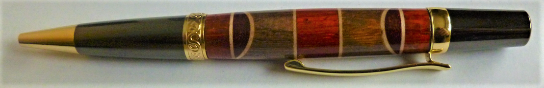 As far as inlay material, the sky is the limit. I have used brass, copper, aluminum, acrylics of all sizes. Never used paper but others have so try it. Used wood veneers that I mill myself. If gluing wood to wood I use Titebond II. If gluing other materials I use epoxy. On the rare occassion I will use CA. But what i will tell you always roughen the material up to give it some tooth and it will adhere better. If I use CA it is always med grade and I will coat both sides and then add even more. Your pen looks well done. You have a feel for segmenting so keep driving.
