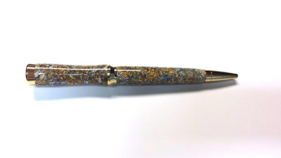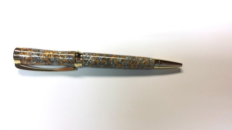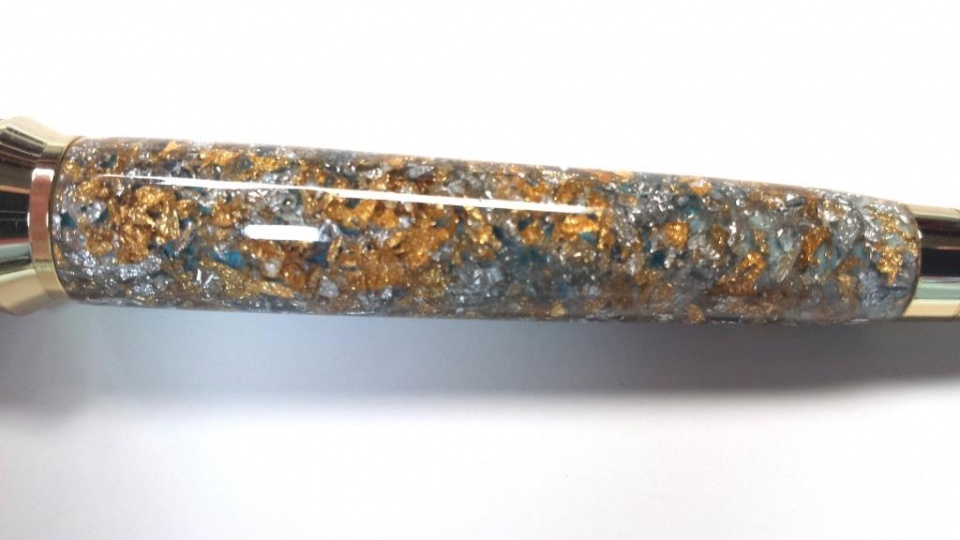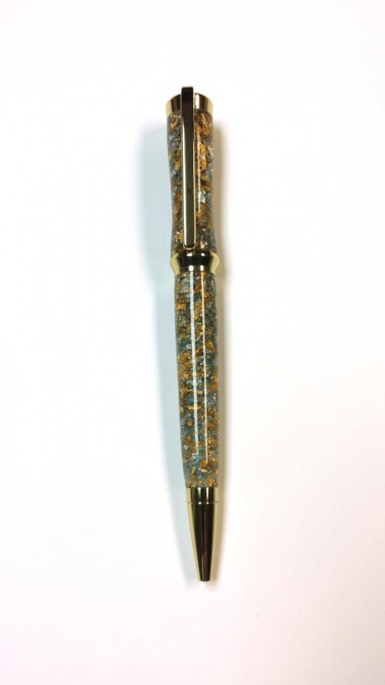 Here is one of the pens I recently finished up. It is a gold and silver metal flake blank from Fool4Peppers. I reverse painted the inside a light blue color. I think the spots of blue in the background look pretty nice.