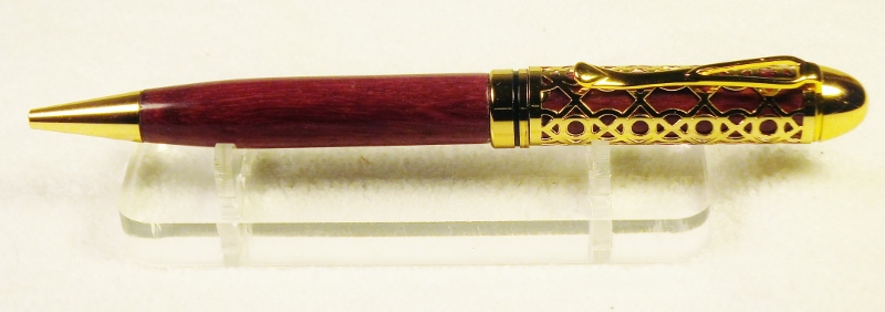 I thank all of you for your comments !! I chose Purple Heart for this kit because of it's color and straight grain. The straight grain doesn't draw the eye away from the pierced top, and the pierced top is open enough to allow the Purple Heart to show through without loosing any grain effect. I would think this pen would also look good if you used Blood Wood. Purpe, Red, and Gold are very rich and regal colors. Jim S