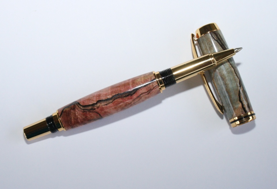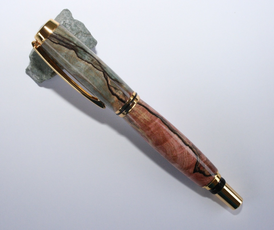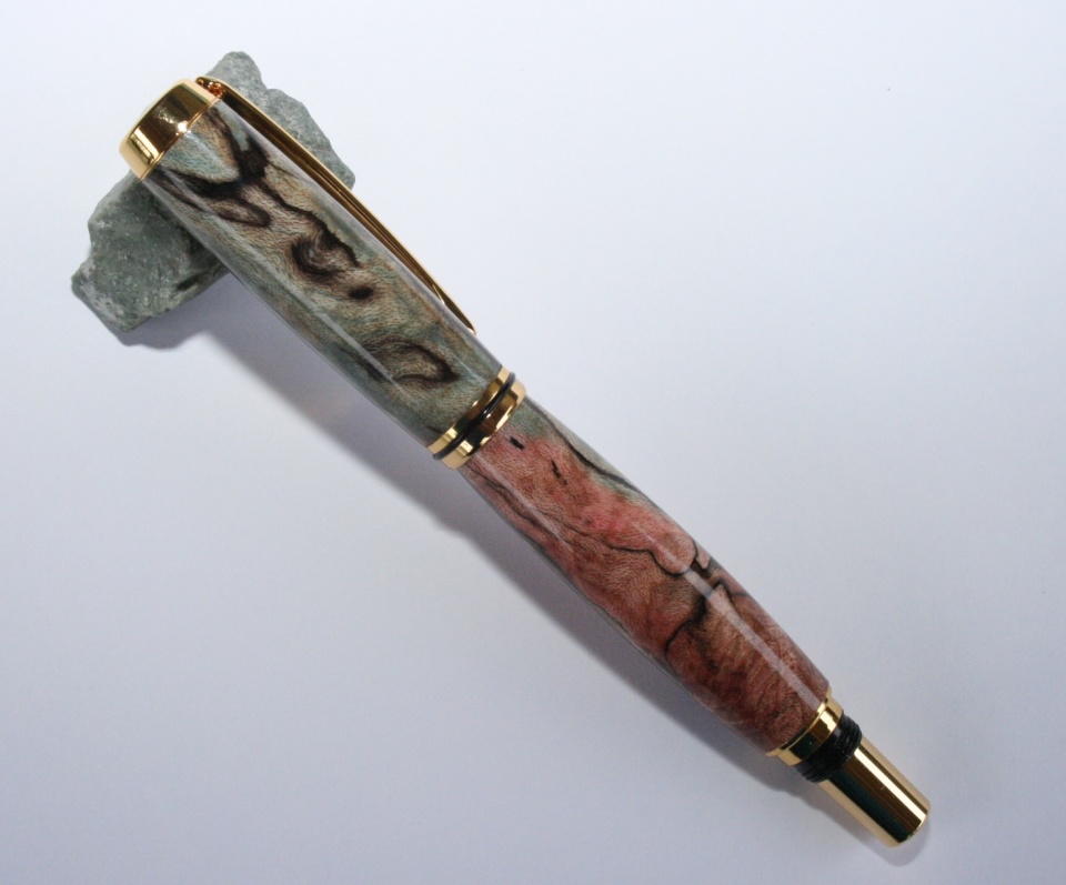 Here's my second pen since I been able to do a bit in the shop. This is a Gold Jr Gent dress in what I believe is Stabilized-doubled dyed-splatted maple. Mike (mikepenturningz) sent it to me. It was a lot of fun to turn this blank I tried to splint the blanks on the blank so that the top was all blue and the bottom all red and It can out rather nice if I do say so myself. I sanded to 12000 mm and finished with 20 coats of WTF over two days (for each blank) and then after 48 hours I polished with Hut plastic polish. I very happy with the way this one came out. All C&C are welcome.