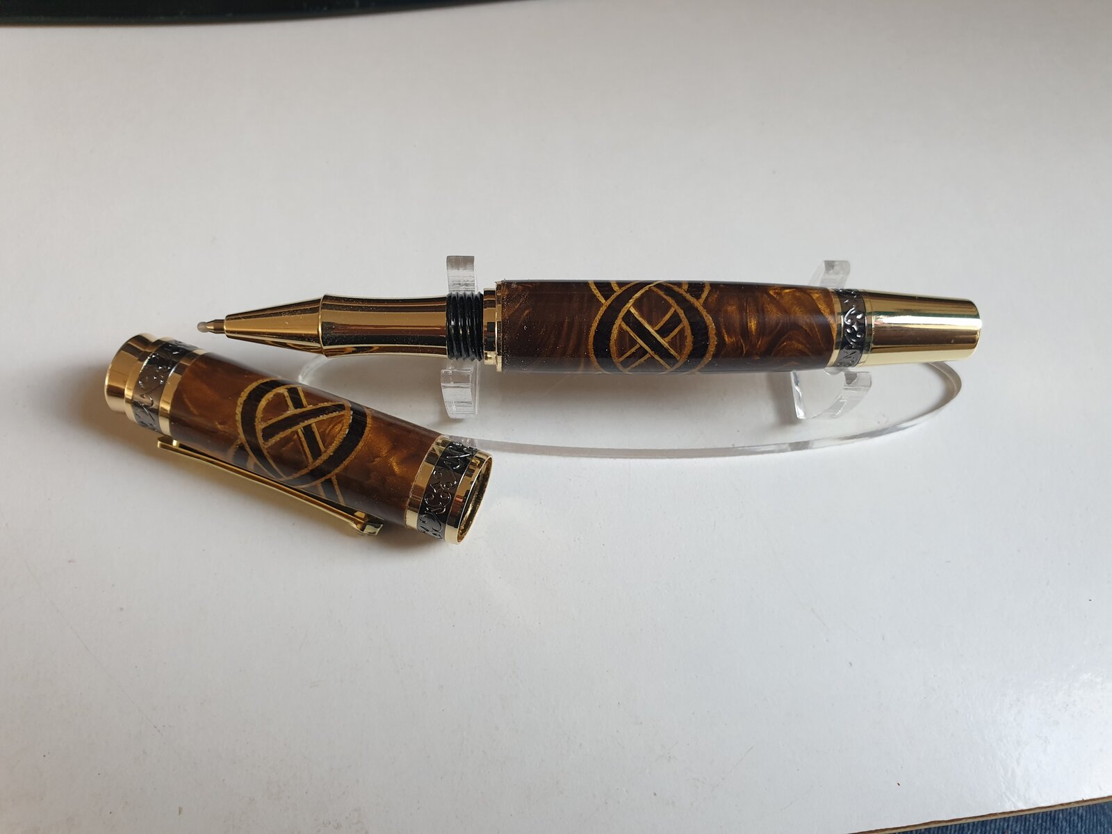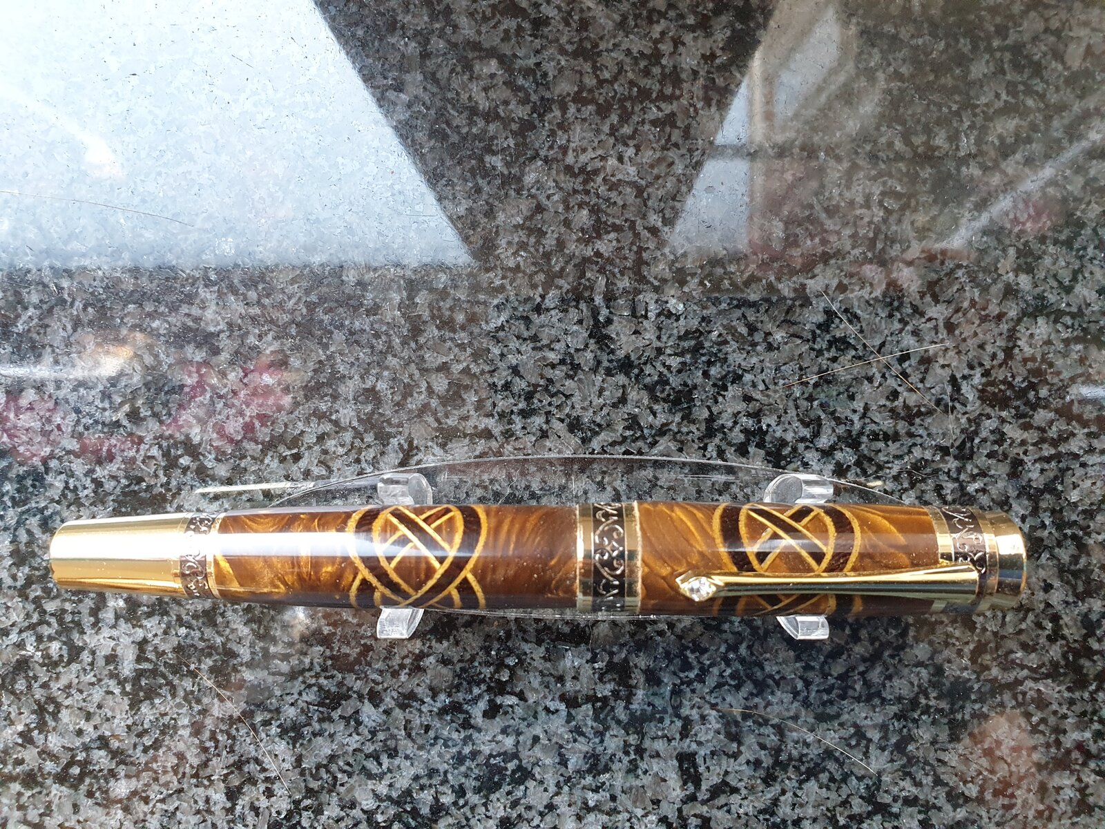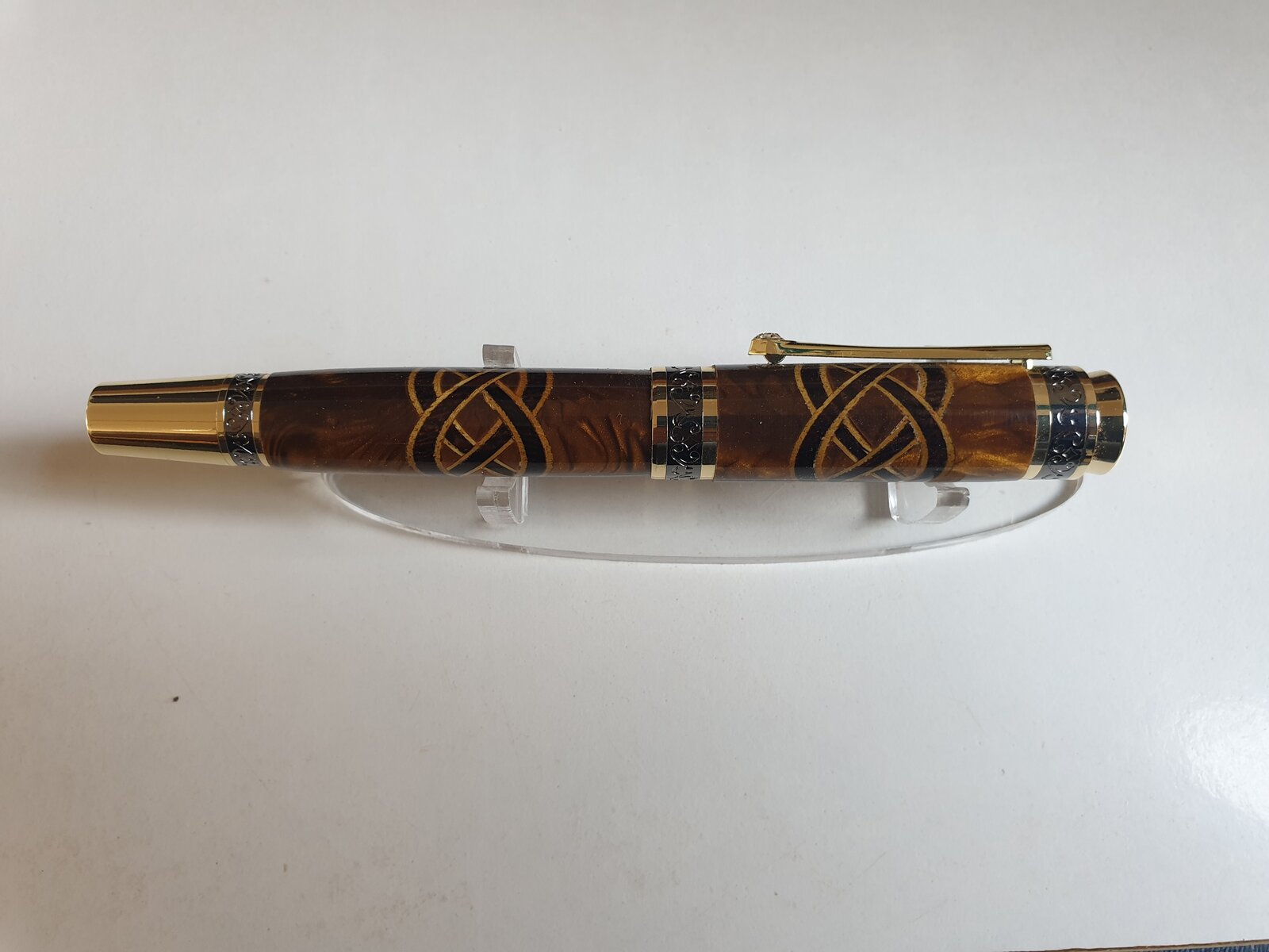 new majestic pen kit. Golden dragon blank, they call it, and added some golden veneer and wenge. Ca finish on a celtic kont pattern.