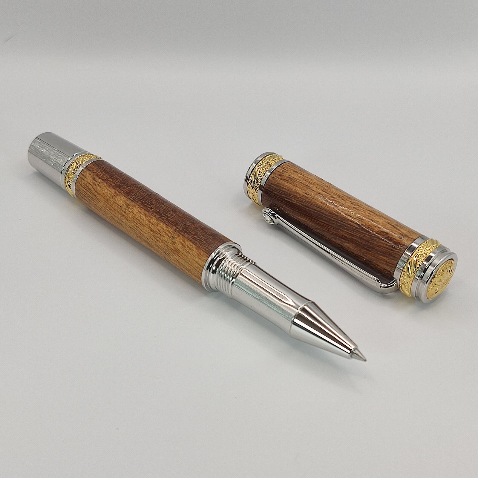 Rollerball pen turned from Goncalo Alves wood. Rhodium and 22kt Gold Majestic kit. CA finish. Love this colour contrast!