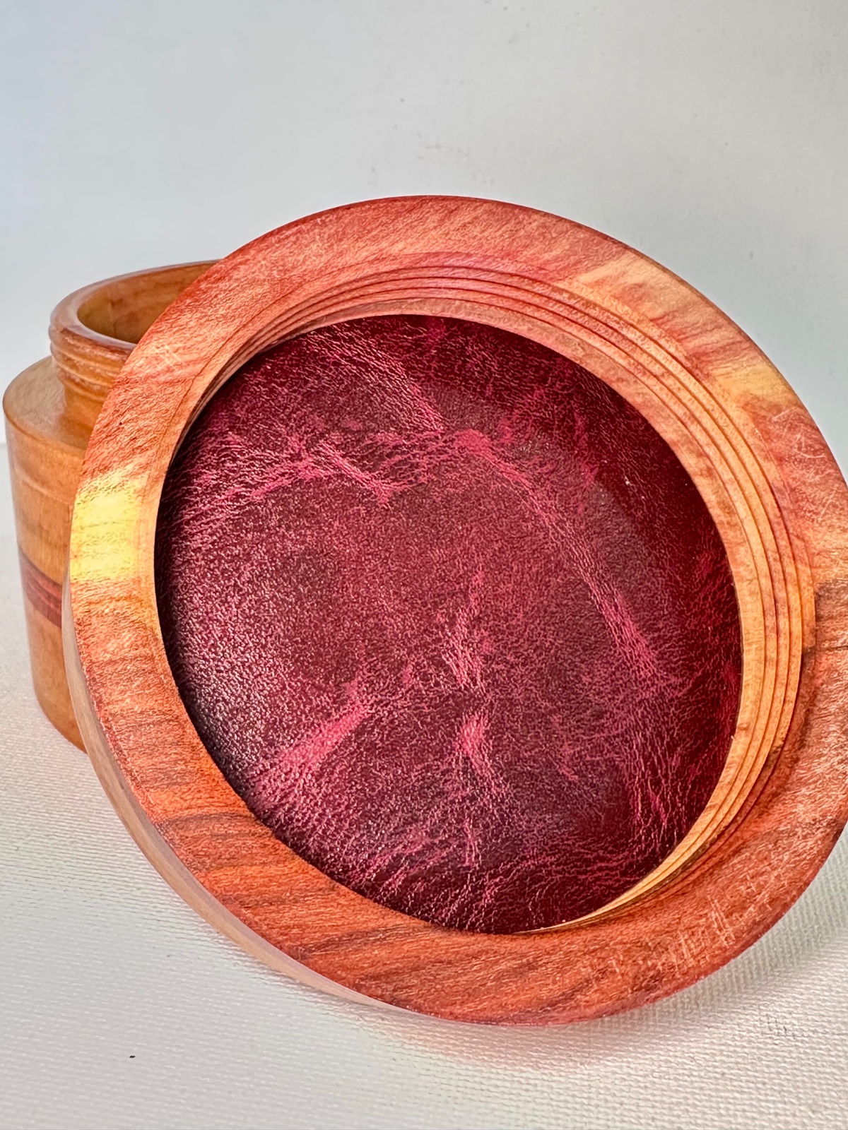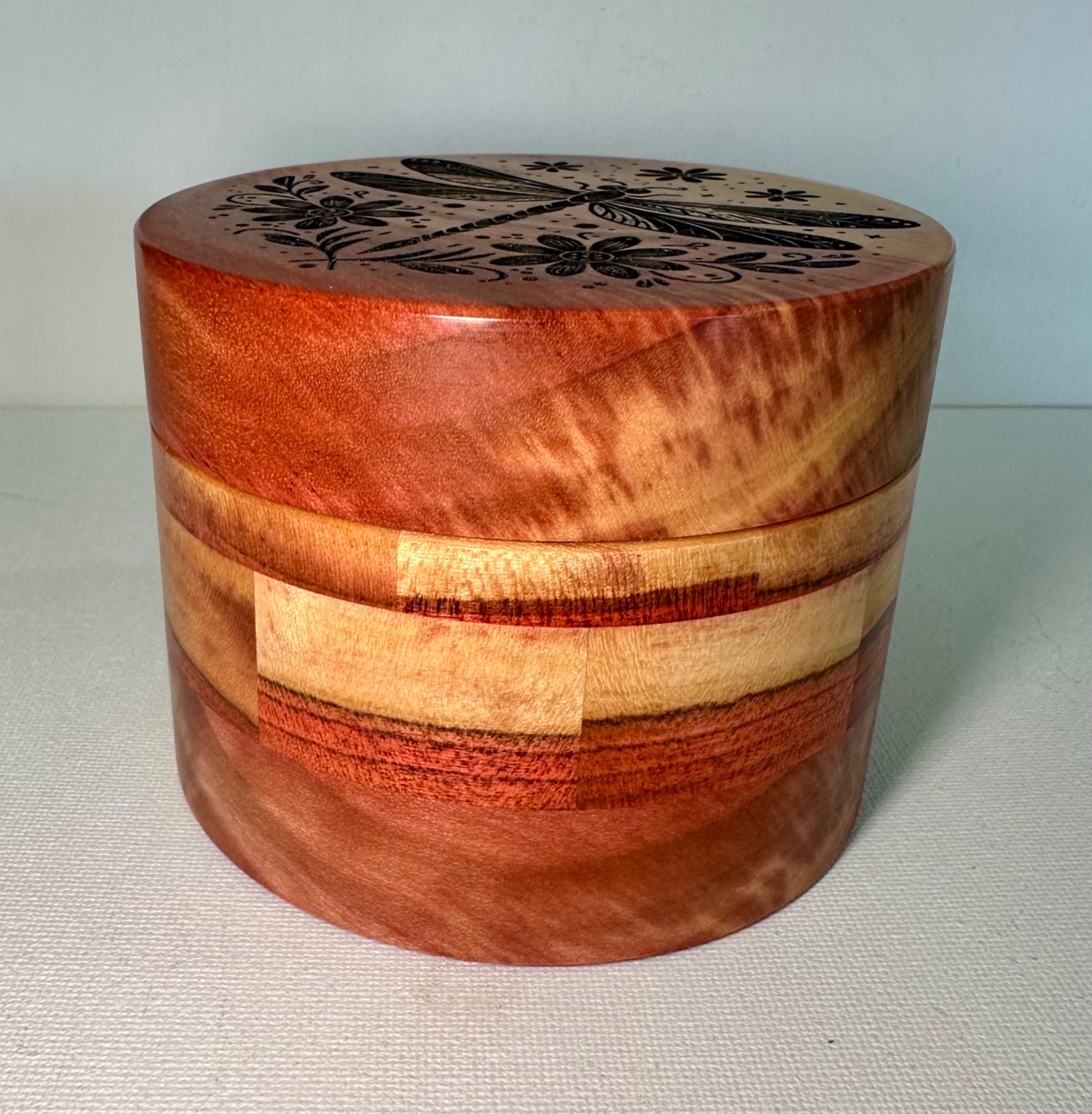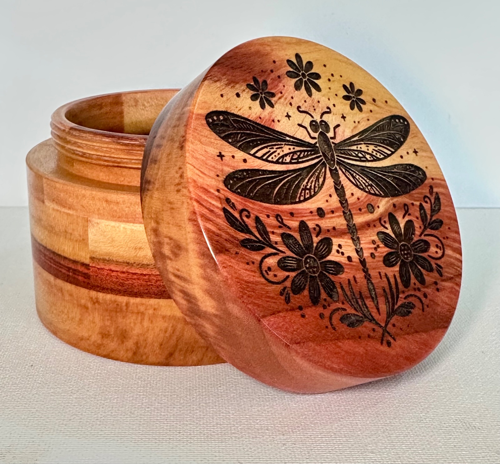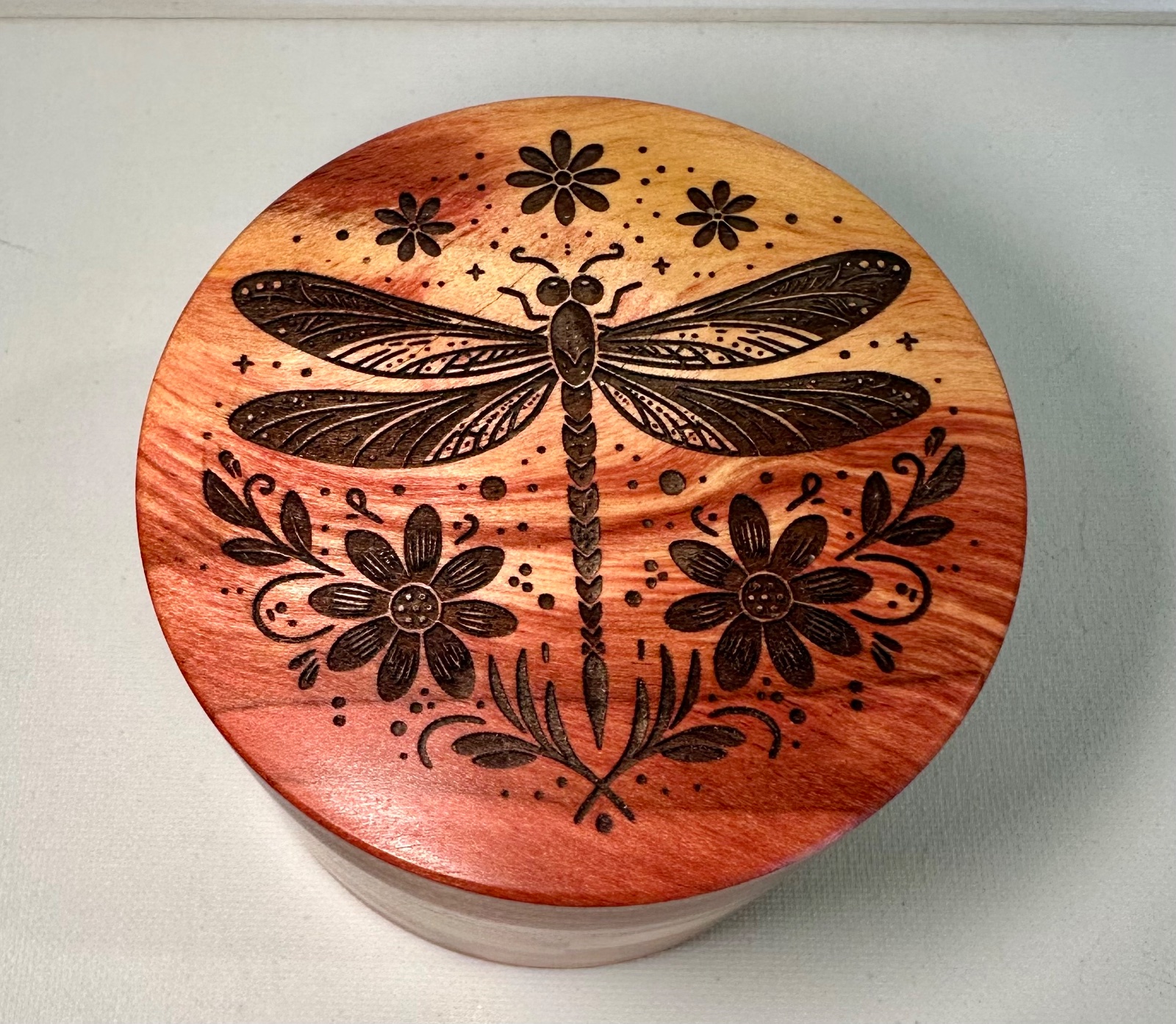 I made this lidded dream box for my granddaughters upcoming college graduation. The top is engraved with a dragonfly image. Dragonfly's are symbolic of many things, including growth, maturity and change. I thought that image was perfect for this It's said if you write your fondest dream on a piece of paper and place it into a dream box, hold the box before you go to bed and again in the morning, your dreams will come true. The wood is some gorgeous redheart and the top and bottom has red faux leather.