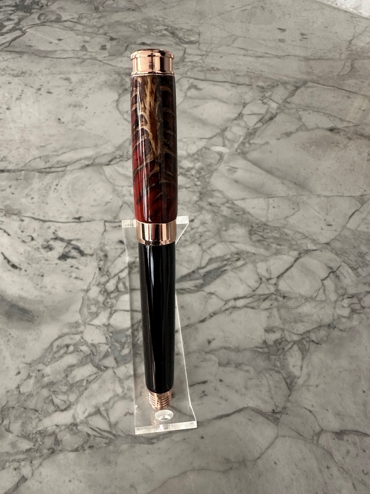Thank you. The plating is actually Rose Gold but does look almost identical to copper. It took me a long time to decide on what blanks to use.That's a really cool pen! I love the choice of woods, and the kit's copper plating really complements both resins. The Pine Cone is a great add too!