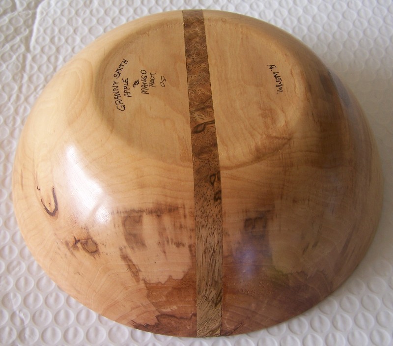 The inner bowl is 6.75in x 1.75in tall and the bigger piece is 9in x 2.75in tall. The mango slice is .5in. The bowls are sanded to 400 and finished with Shellawax Glow.