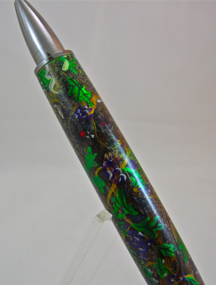 Then "it" started, a couple of red crystals for eyes and some white for teeth,Grape vine bark was glued to the tube and it was cast, OOOOHHHH NOOOOO,air bubbles ! No problem,I'll just turn the blank down past the bubbles and re-cast it, Then I got to thinking, what if I painted some grape vines on it;