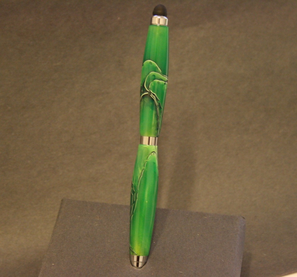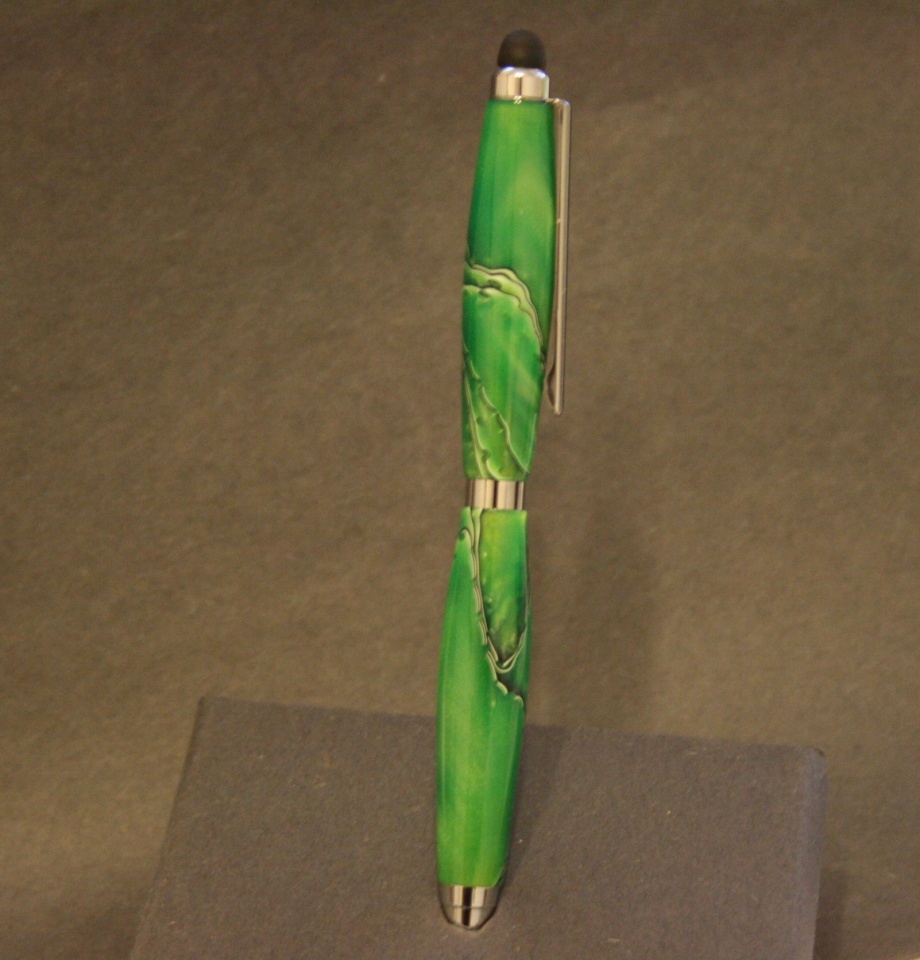 Ok it not a stylus for a grasshopper. Evelyn liked the stylus I made so much she wanted one of her own, but she wanted a slim style and a green blank. Here is her finished stylus. I really like (and so does she) the way it came out the coloring of the blank is great. I wet sanded the blank from 1500-12000 mm and used Hut plastic polish to add a bit more gloss. Any and all comments are welcome