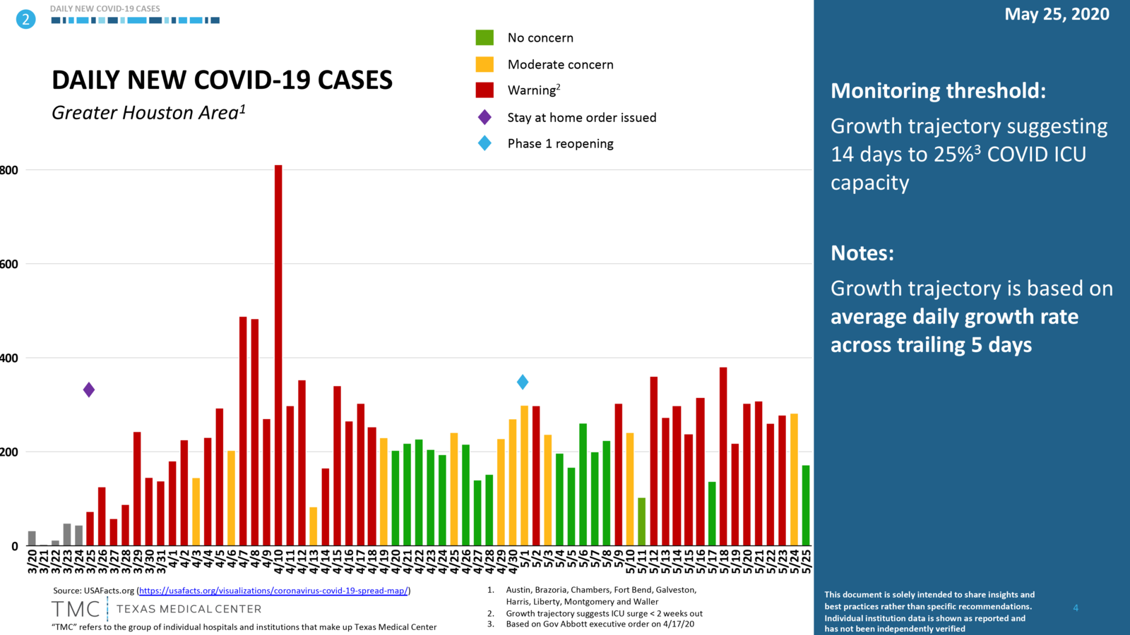 I'd be concerned. After a period of improvement, Houston is seeing increasing new daily cases about 10 days (and beyond) after phase 1 reopening which would reflect increased transmission in the city population. It's hard to tell without the trailing 5 day growth rate plotted which way the trend is really going, and the final two days plotted which look good fell on the holiday weekend (all weekends generally show decreased cases), so you aren't going to know if the trailing growth rate is rising or falling yet and whether you are going to see entry into an exponential growth rate related to relaxation of restrictions. These graphs are pretty but they would be far more informative if the trailing growth rates were plotted against the bars and the y axis could be viewed as a logarithmic plot. Good luck, stay safe.
