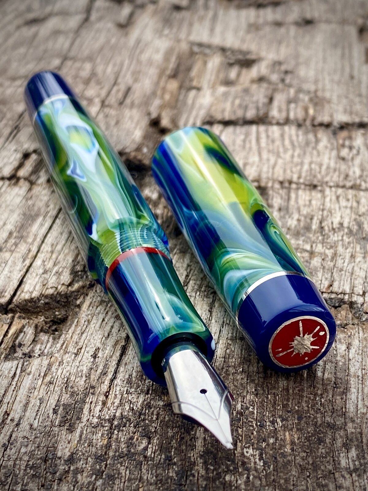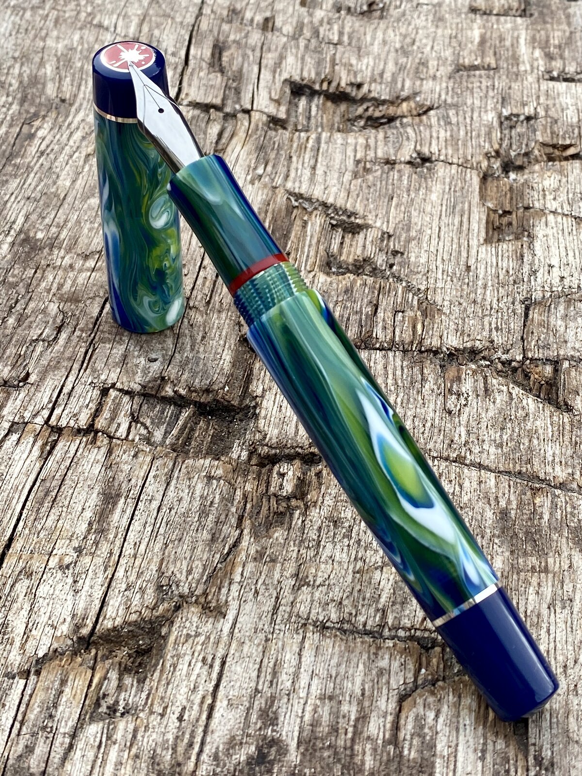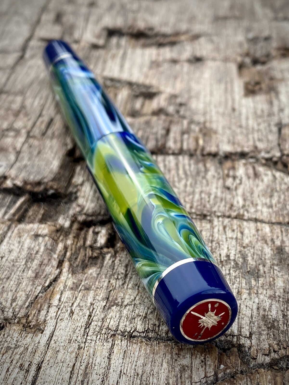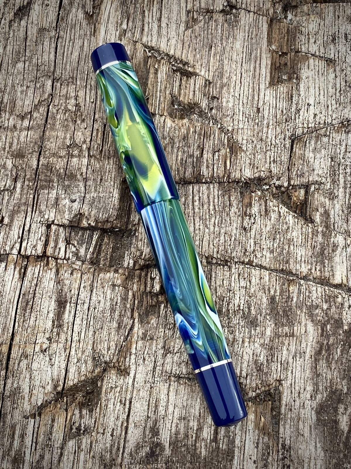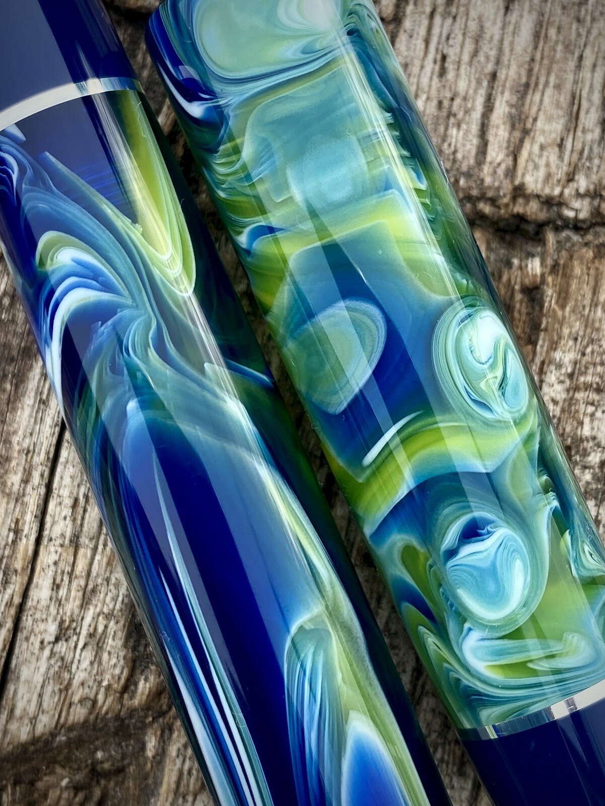 A fairly straightforward pen but every now and then I come across a material that I really like a lot and thought this green/blue erinoid acrylic looked nice with the blue acrylic finals and sterling silver accents.