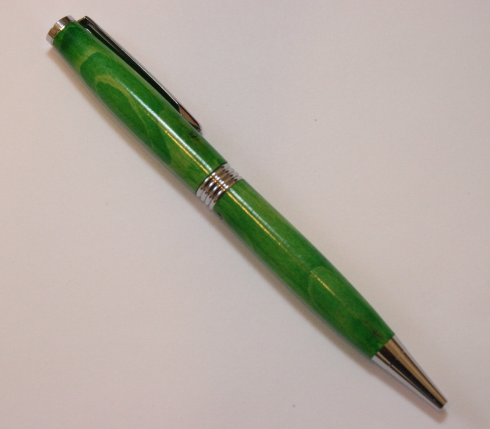 I tried my hand at making another blank, this time from applewood. The blank was cut from one of our apple trees (see picture) this morning. I dried it in our microwave, it took about 12 times at 30 seconds each time to get the weight to stabilize. I dyed the blank using food coloring and DNA. I'm happy with the way it came out, the applewood grain does not show all that well as it a really light colored wood but the green dye made the grain pop. I went with chrome plating because I though it made the green stand out more. Any and all comments are welcome.