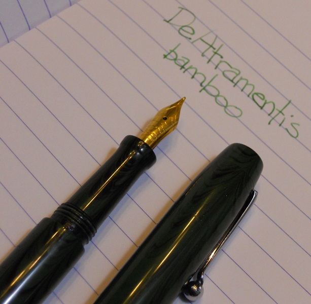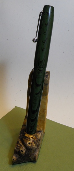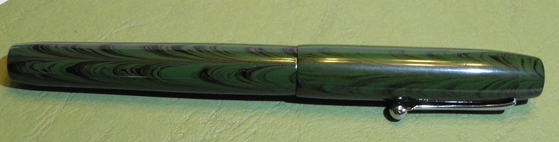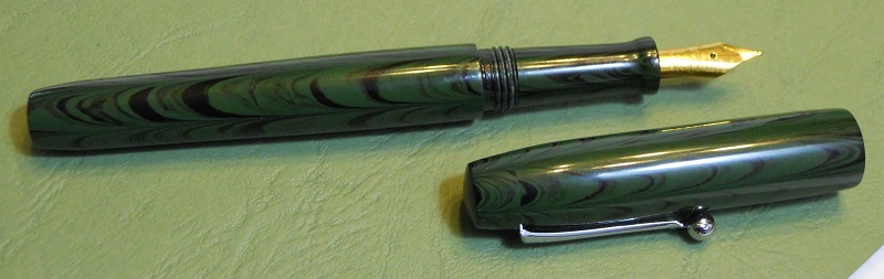 Kitless #4. Green ripple ebonite from IPD with Bock #5 nib and feed. Im really happy with this one, although of course it still has a few flaws. Finally got a grip section done where everything fits perfectly (woohoo!). Learning new things can be fun!:tongue:
