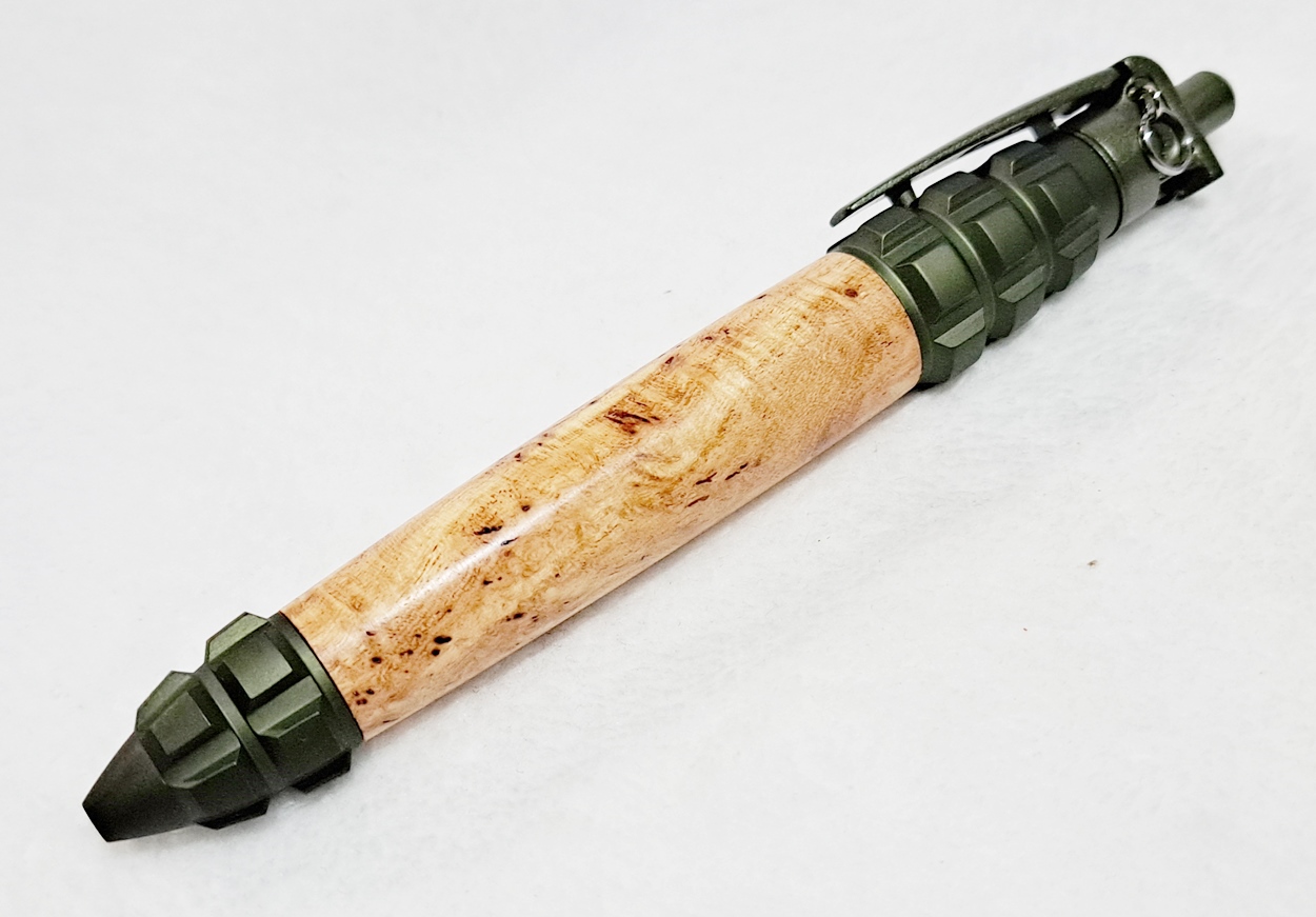 This is a PSI Grenade click pen in OD green. Very unusual, very heavy design. The clip can't be used as a normal pocket clip, it's only used to retract the refill. The wood is locust tree burl. The finish is Pens Plus.