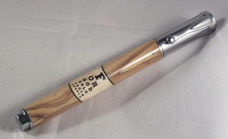 Then the one I am most pleased with. The groomsman is an ophthalmologist and a Sunday School Teacher. So Bow on each end and Birdseye Maple in the middle. With an Eye Chart decal that says "For God So Loved The World". Fourth.
