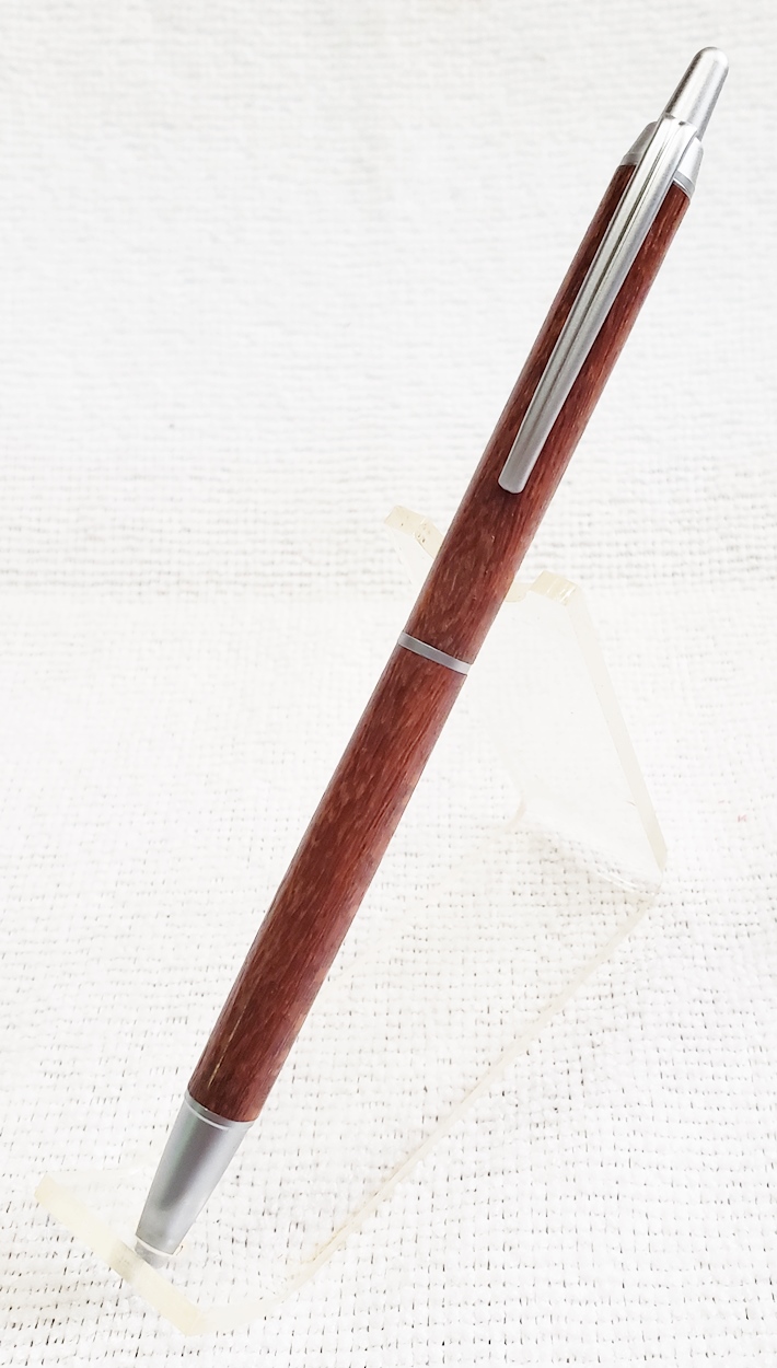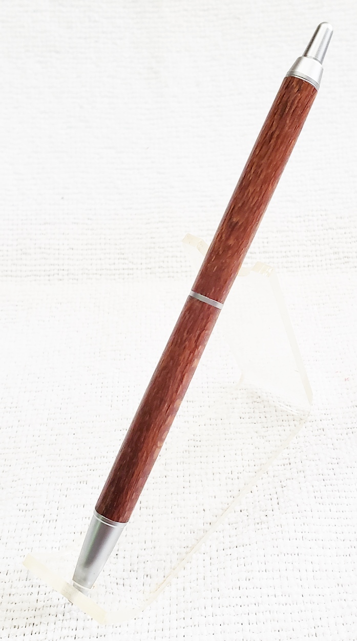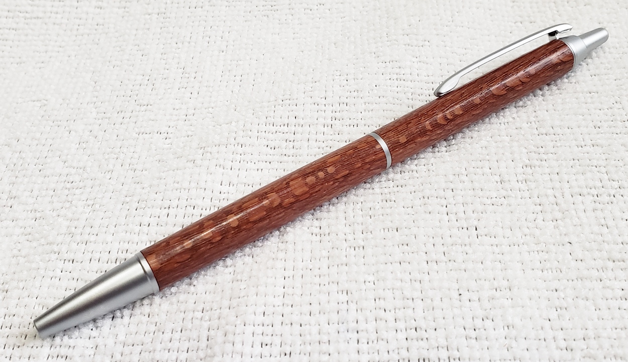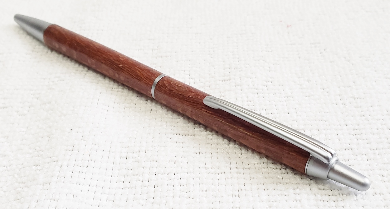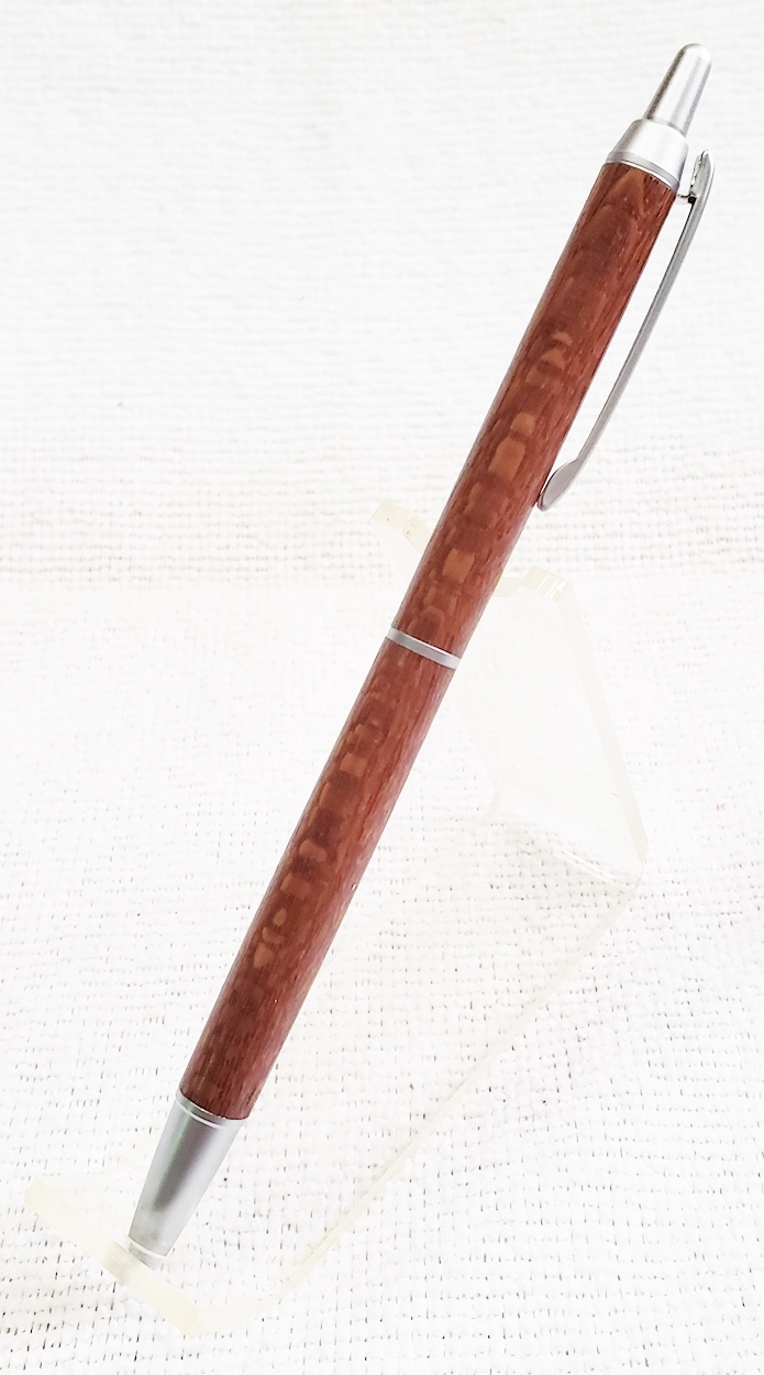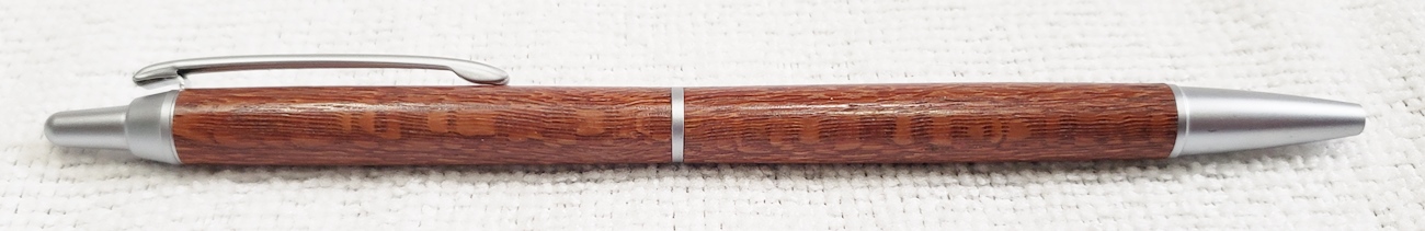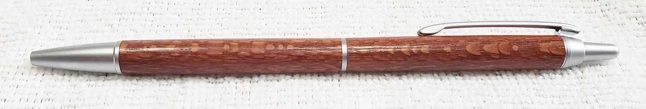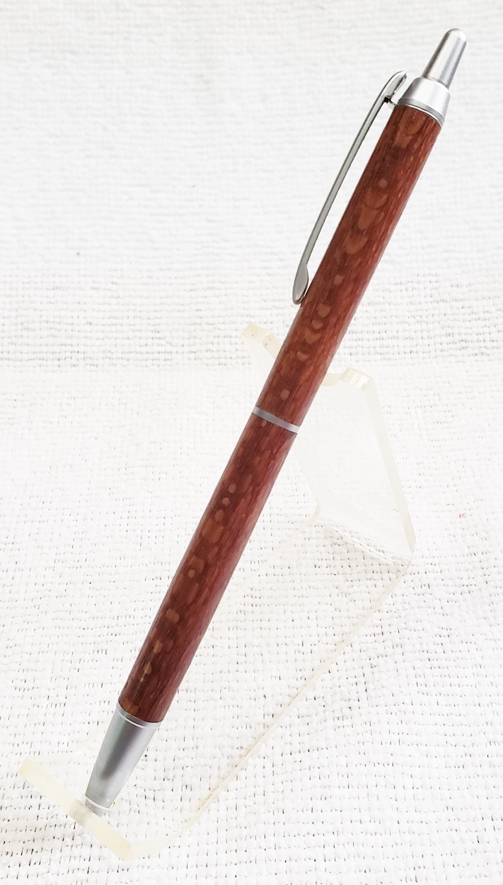 This is a PSI Groove click pen in satin chrome. The wood is leopardwood from Woodcraft. The finish is Pens Plus.