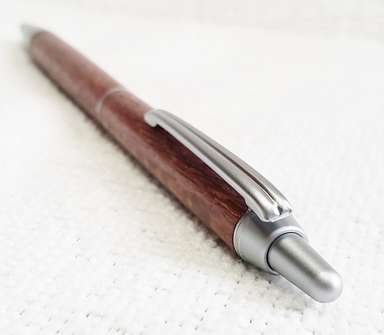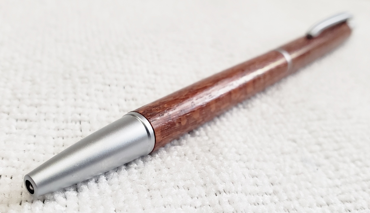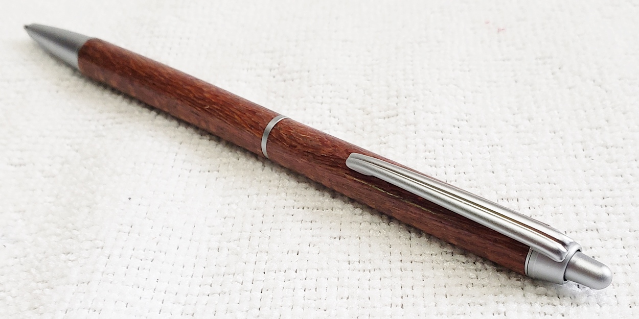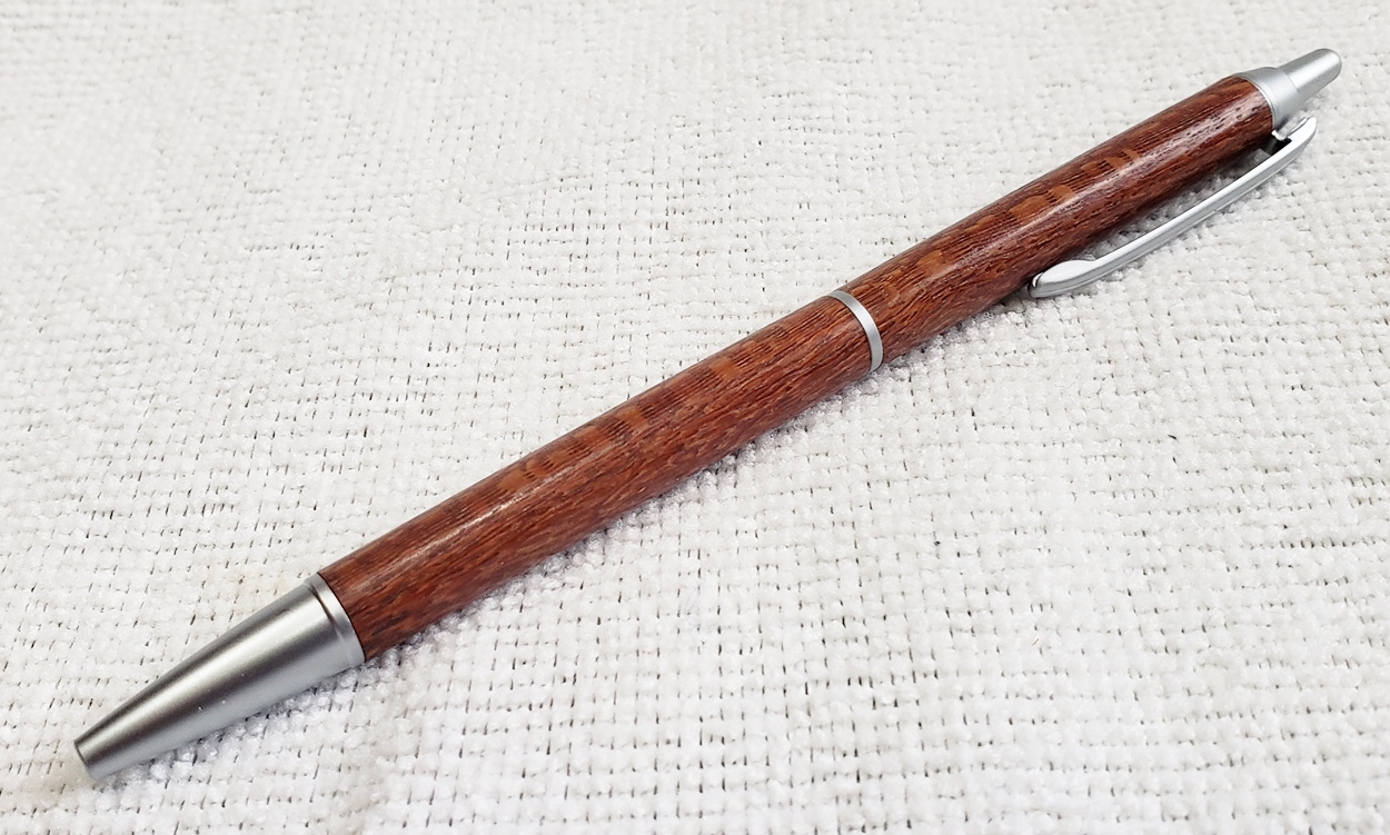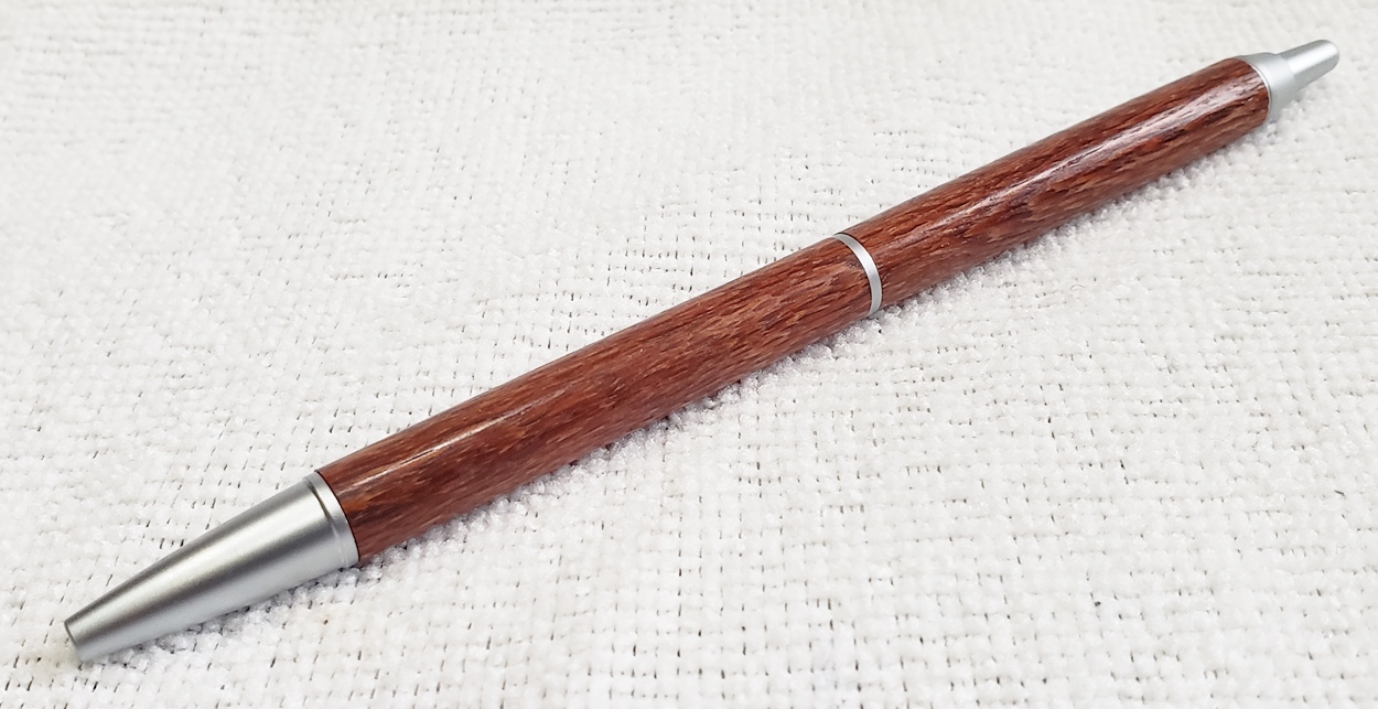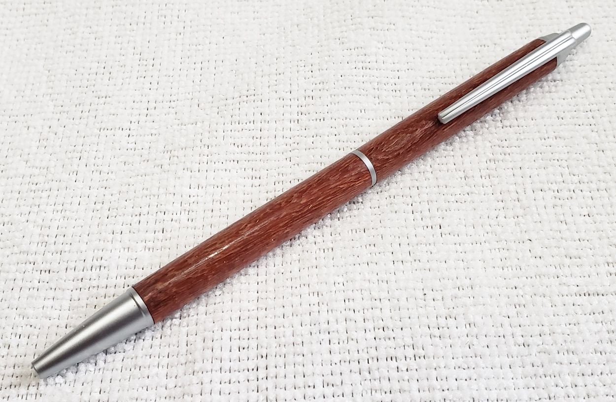 This is a PSI Groove click pen in satin chrome. The wood is leopardwood from Woodcraft. The finish is Pens Plus.
