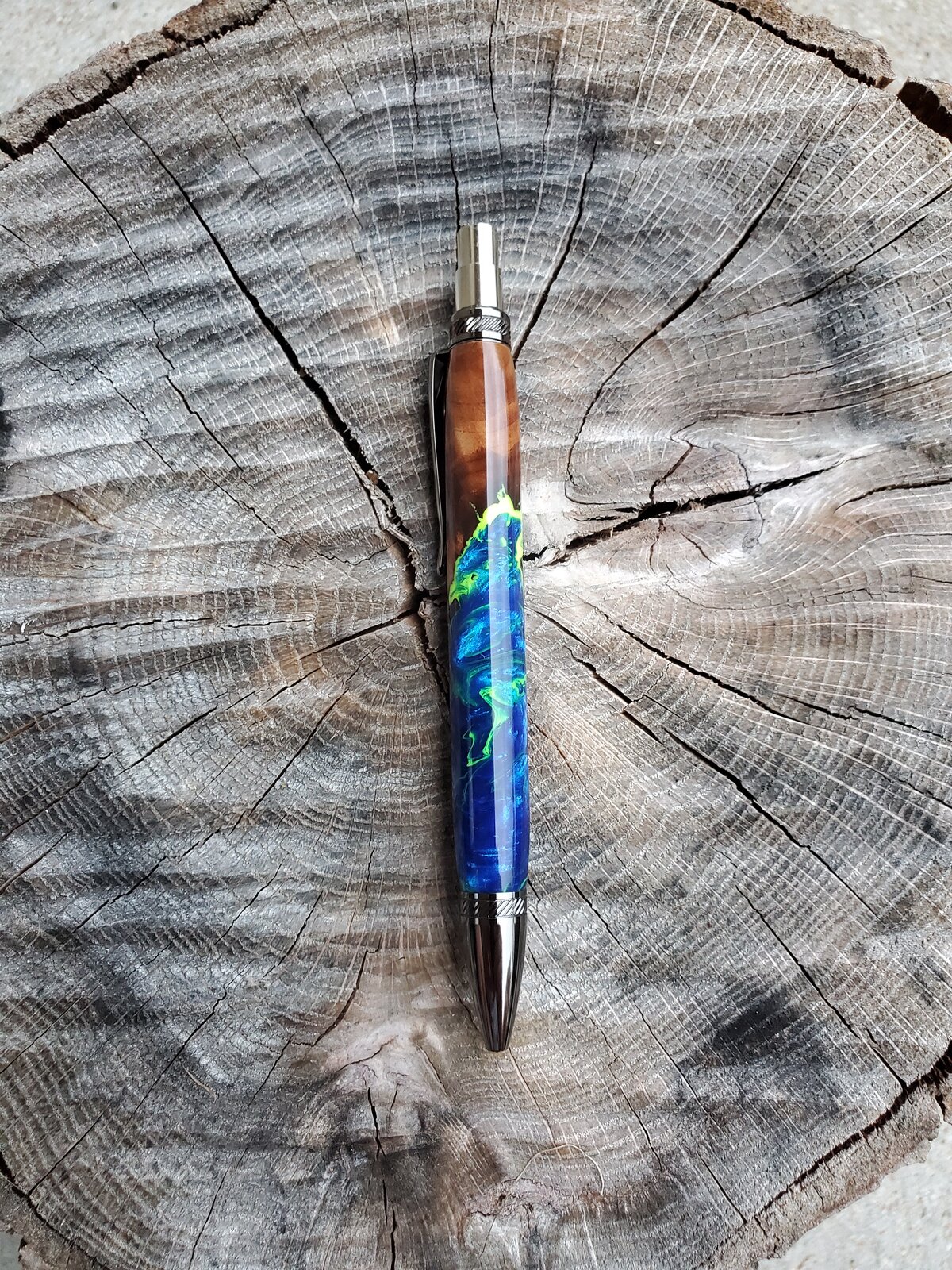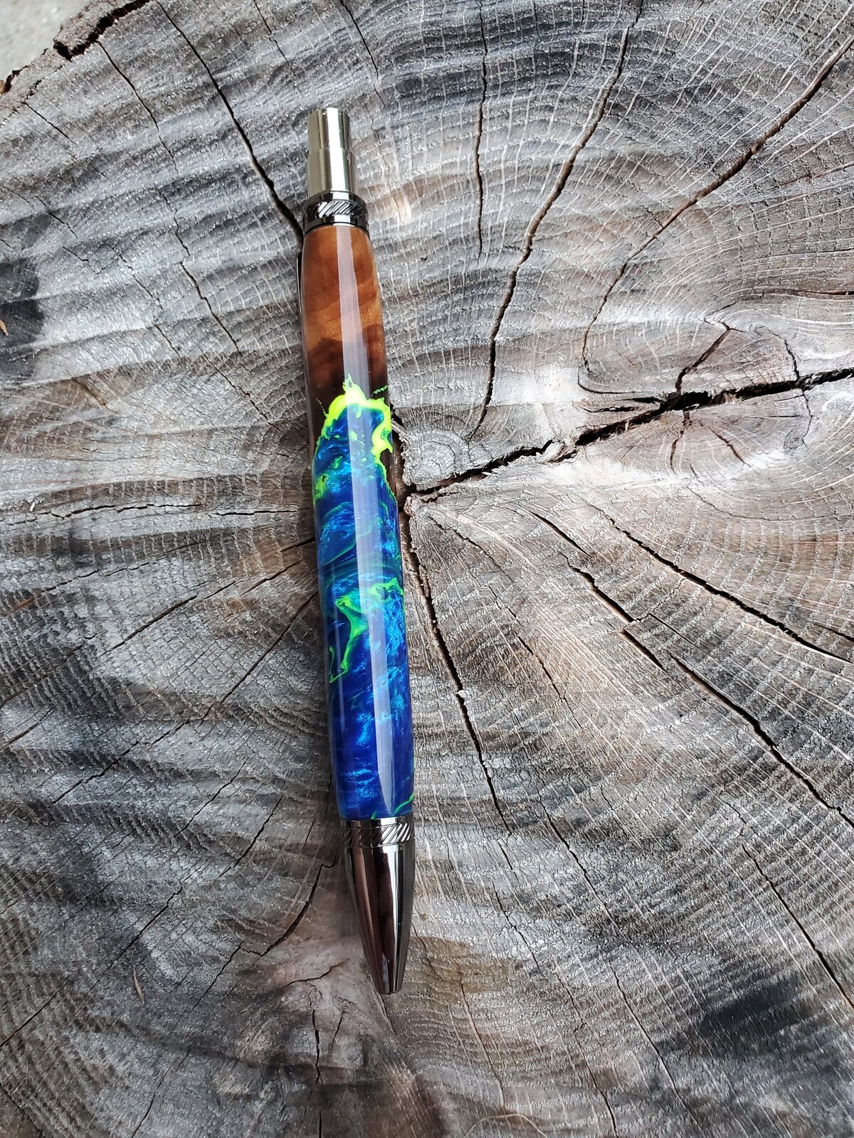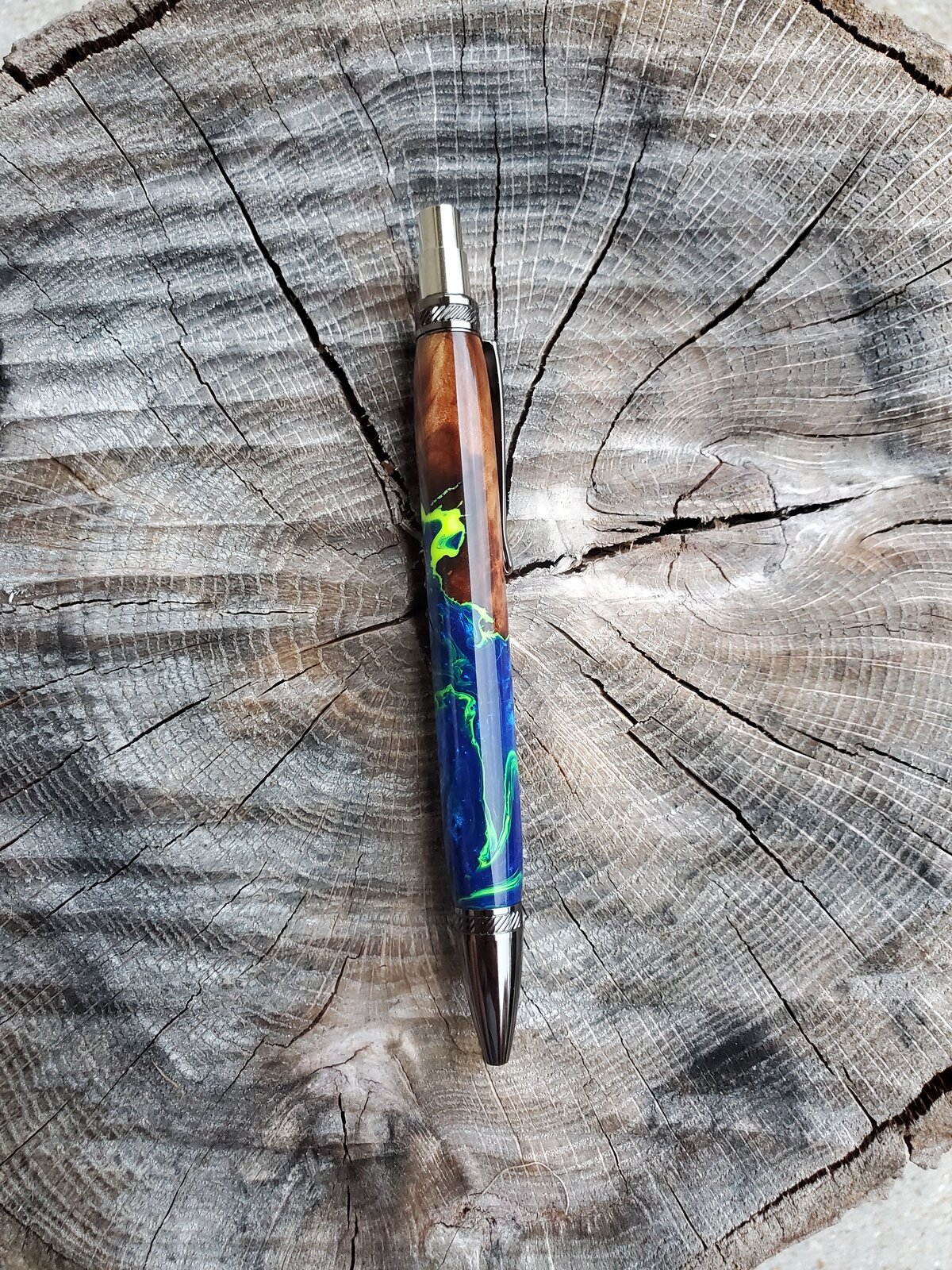 L lfox Member Joined May 12, 2020 Messages 8 Location Missouri Sep 1, 2020 #1 Finished this blade click pen using a hybrid blank and a ca finish