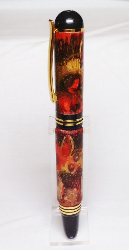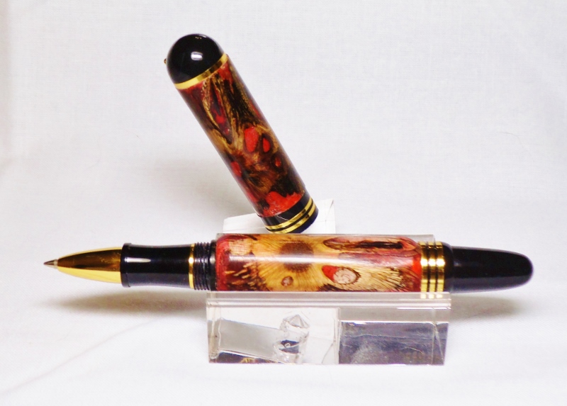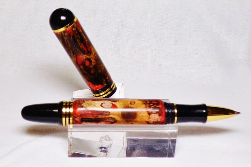 This is another fantastic Banksia blank George sent me from down under. I used a Washington Rollerball pen kit from Rockler in 14K Gold and Black. The tubes and blanks were treated with a Watermellon Alcohol Ink to tint them a metalic red. Finished with 8 coats of thick CA, sanded to 1200, and Polished with One-Step Plastic Polish. This blank was not for the faint at heart!! It had some voids to fill. and the bottom third of the lower blank blew up on me. Luck was with me and I was able to repair the blank. Blank also had a lot of clear spots that worked in my favor to bring out the metalic tubes. Sorry for the bad photos, I used a desk lamp and hand held !! Jim S