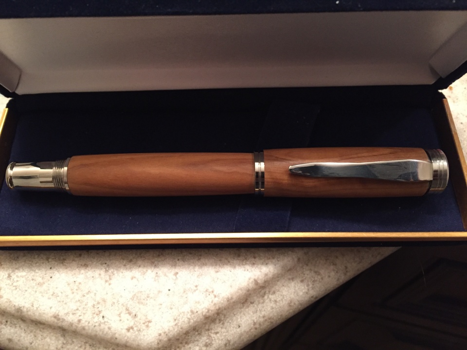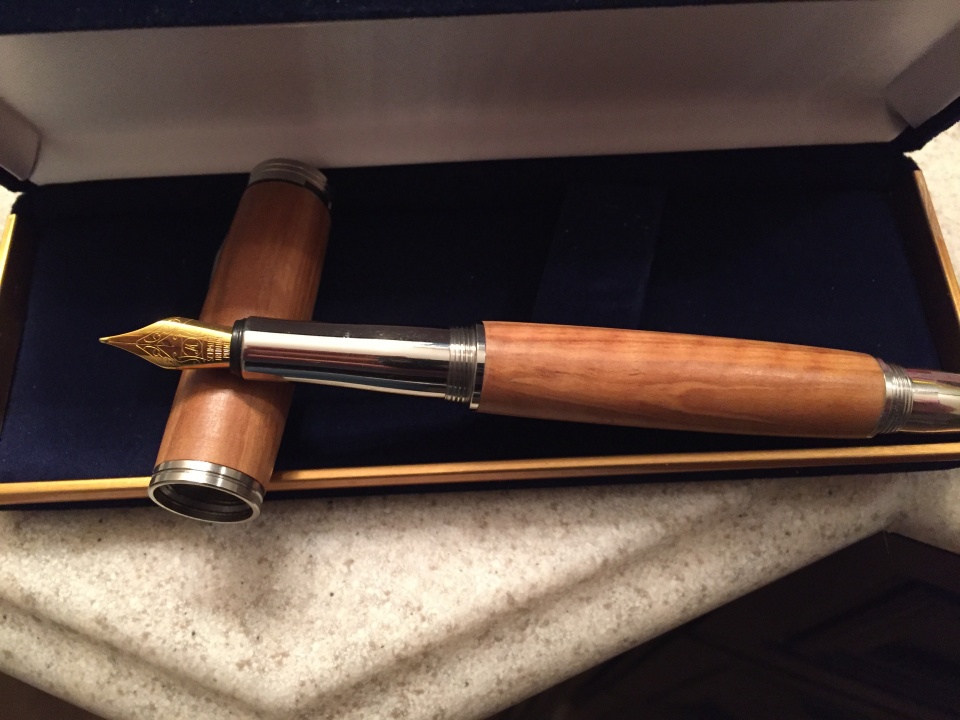 I purchased 2 of these Pen kits a couple of years ago on cleareance at Woodcrafters. I made one for myself out of Walnut and made this one out of Olive Wood for my boss for Christmas. He's been saying how he would like a good fountain pen. To my suprise this is one of the nicest fountains I've used.