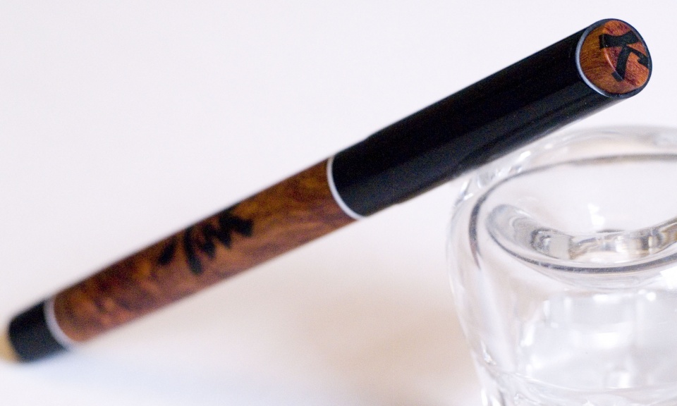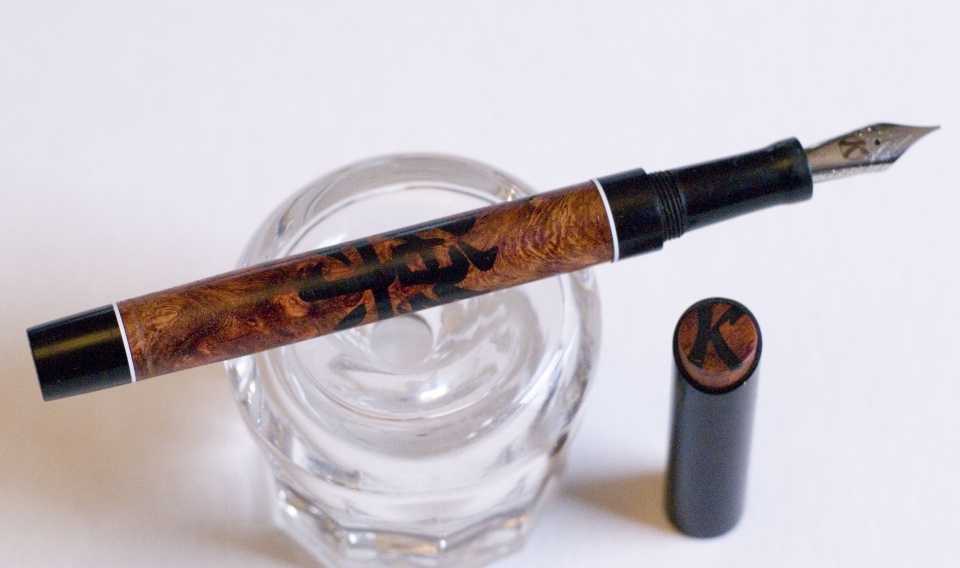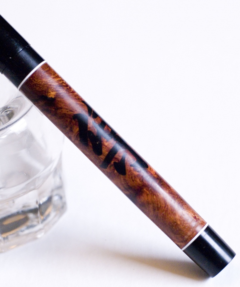 The Chinese ideogram for happiness and music is inlaid in this gorgeous piece of amboyna burl. Trimmed in ebonite, it's fitted with a 6mm JoWo nib. Thanks for looking! Doug