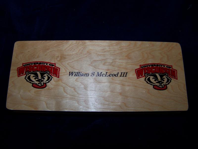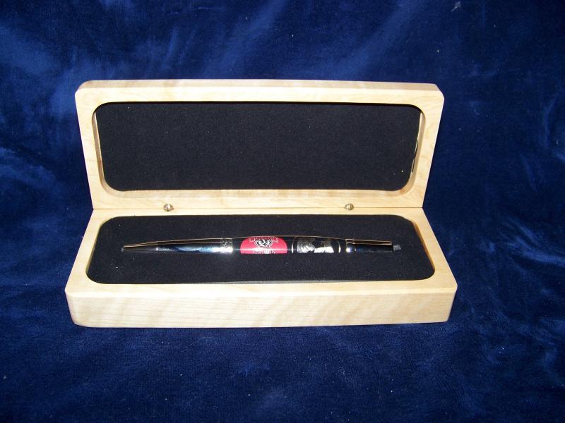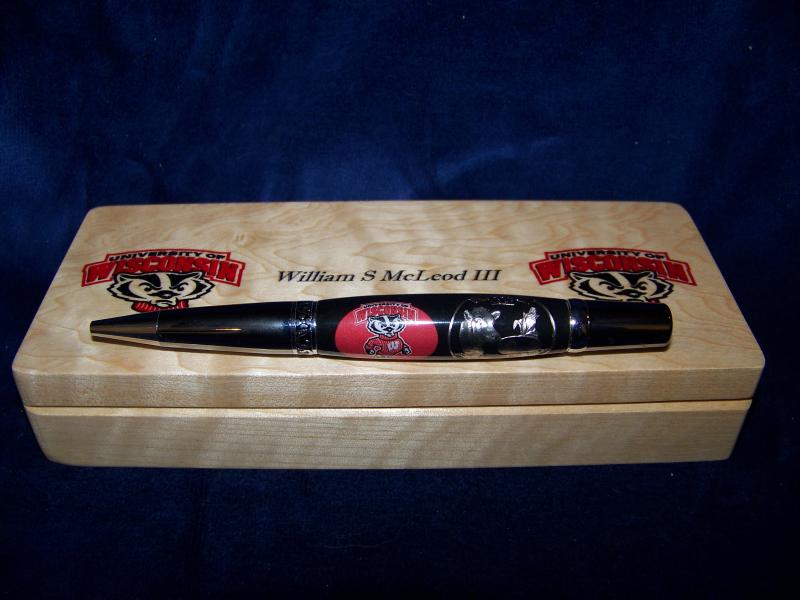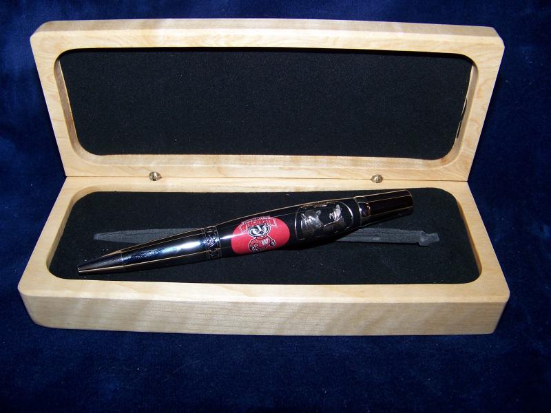 I made this pen for my BIL Bill for his 60th birthday. He is a University of Wisconsin Alum, and very proud of it. It is a Sierra Elegent Beauty with a Wisconsin Quarter pen blank from Seaumus (my first one).. A special thanks to Seamus Rooney for making the blank and to Constant Laubscher (I hope I spelled that right) for making the display box.