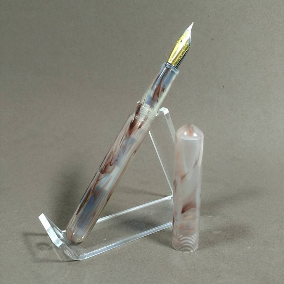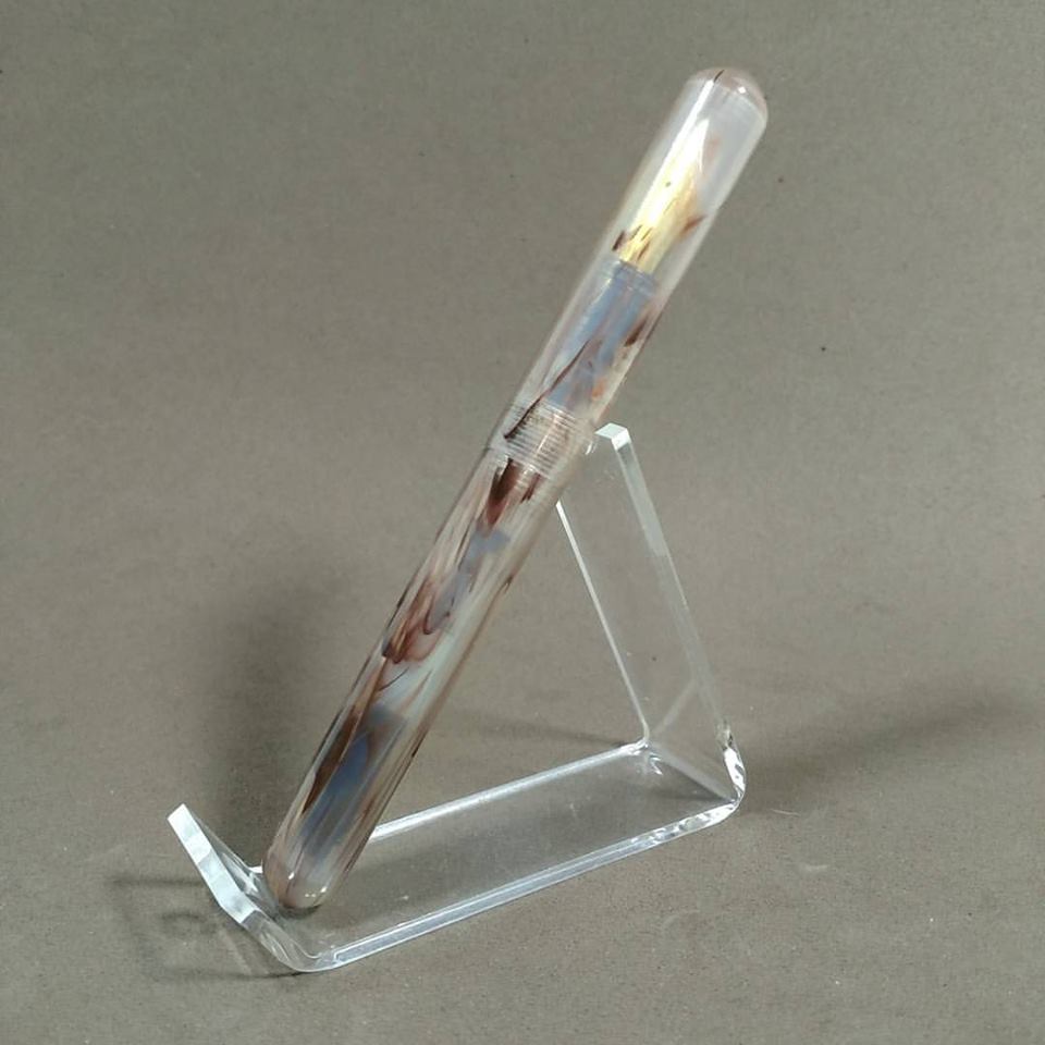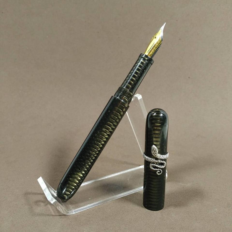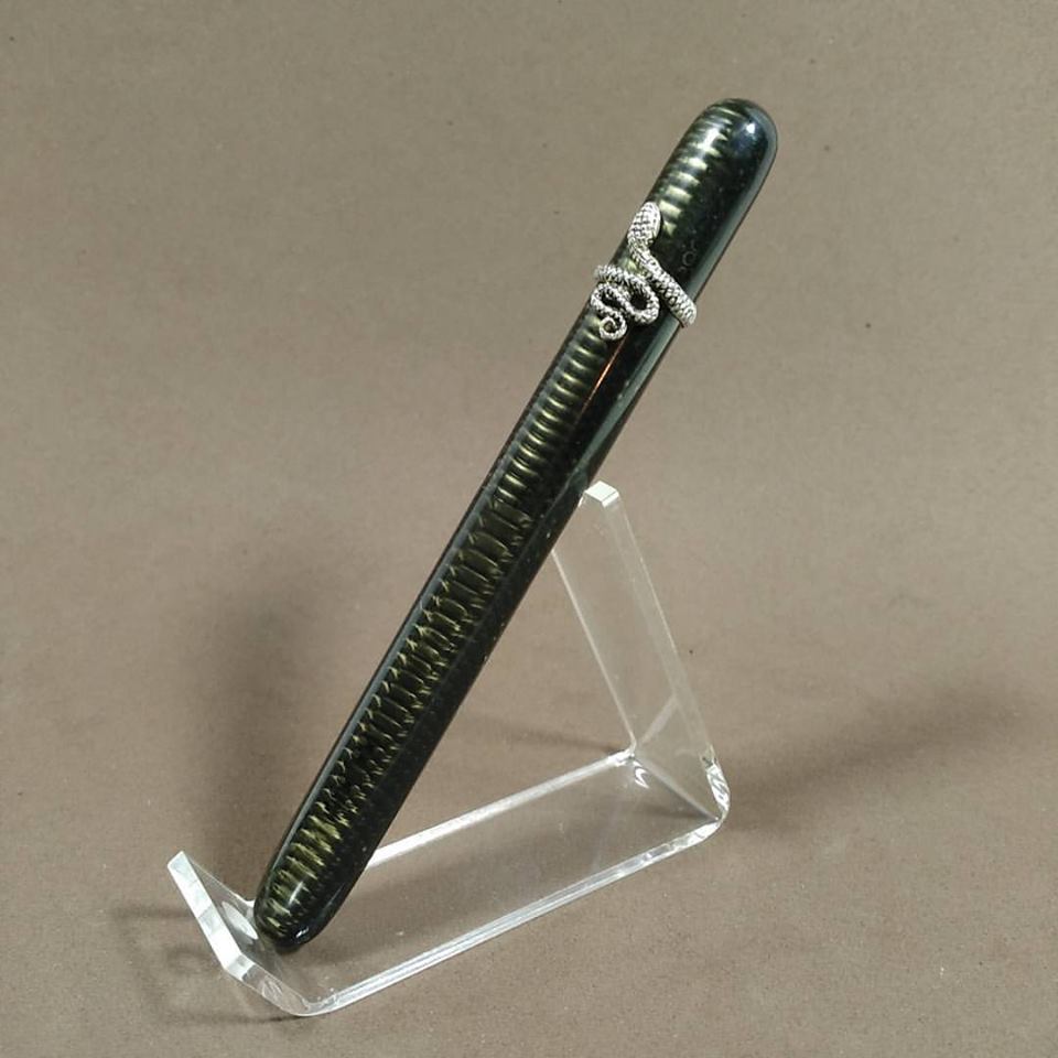A green striped french cellulose acetate with snake roll stop and a smokey quartz acrylic.