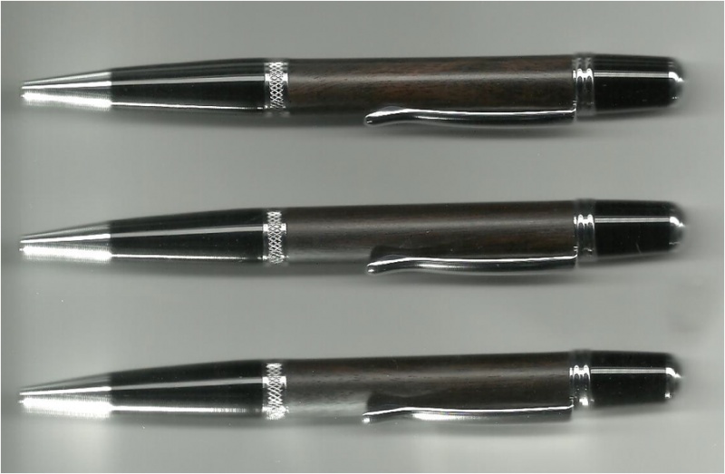 Hi Folks. Great forum. Looking forward to learning about making pens and contributing once I know which end of the pen writes. I've been into woodworking for 30 years and have had a Delta Midi lathe with extension for 10 years but just not getting around to pens. My 1st 2 attempts didn't go so well so they ended up in the fireplace but #3,4 and 5 are pictured below. Not quite a matched set but was good proactice and came out okay. It's gaboon ebony with Sierra metal guts and tung oil finish. Any improvements or words of wisdom are always appreciated.
