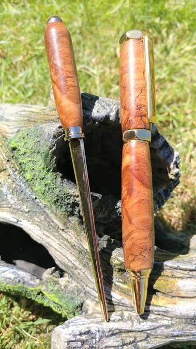 This is a pen and letter opener set I made for my sister's graduation (Masters Degree). It's made from Stabilized Maple Burls.