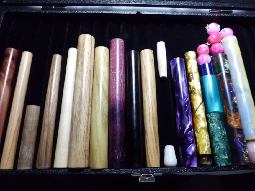 This is a picture of my Samples box. You'll notice that I turn a lot of blanks round, and then sand, finish, and polish them while they are still full length blanks. This helps my potential customers see what a finished pen may look like, and also helps me to streamline the process of making a pen ... it's already round, I just need to chuck it, cut to length, drill, ect ... I turn all my barrels round before cutting and drilling, so this does save me some time as well.