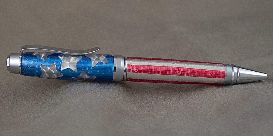 Finally, I had some "leftover" foils from other projects. I used aluminum foil as the base for the lower barrel, and overlaid red-painted foil "stripes." I used blue-painted foil for the upper barrel, and used a star-shaped paper punch to punch stars from leftover reflective tape I used for the lure pens.
