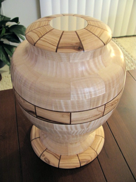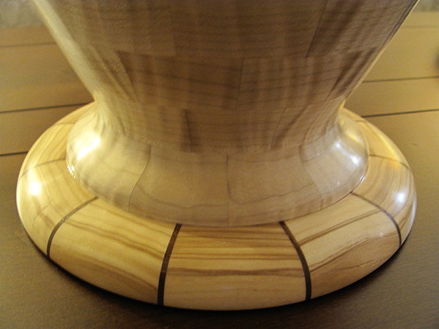 The IAP member that was going to make it couldn't because of the size.I was able to have it made by a member of the San Diego woodturners,and I had asked that it be made with curly maple,walnut and olivewood in a segmented design.I wish I had the talent to do it,but pens and bottle stoppers are all I can do at this time.