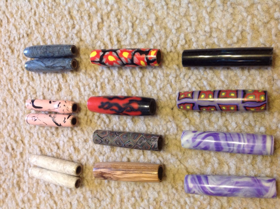 Or in the case of the quilt patterns I slice them thin and place them on the tubes and gently roll them until all pieces meet. Then I turn using 120 grit to get them down to size and to shape if needed. Then I work my way up the grits. Wet sand a little then CA finish.
