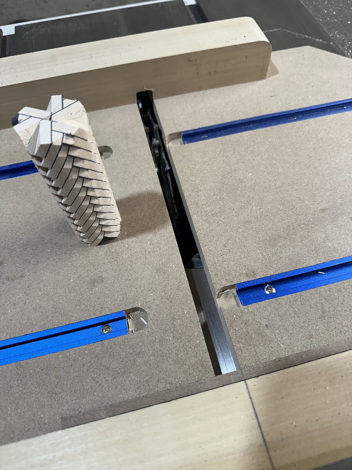 Sanding the corners off a glued up 360° herringbone is not pleasant. Cutting them off with dado blade and sled is a piece of cake. I already had the dado sled PS, in earlier attempts, I broke a bandsaw blade trying to cut them off. It was my own fault, making an unsupported cut.