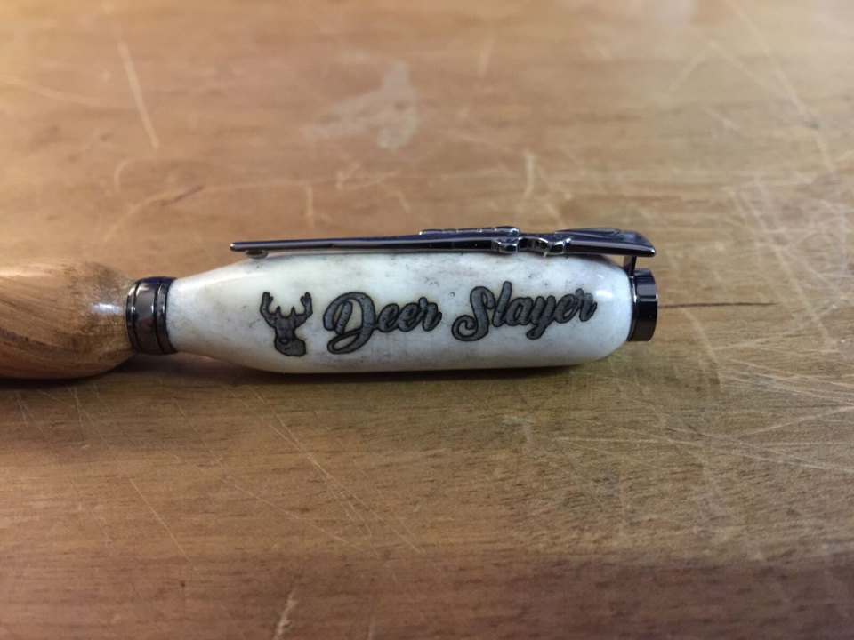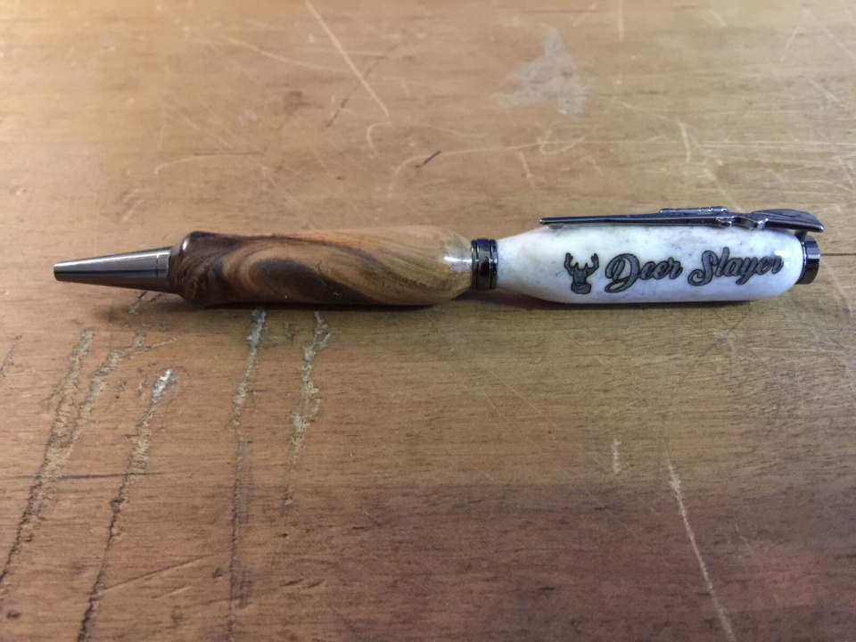 Twist pen I made. Upper is deer antler and lower is Hickory. I love the effect the burning had on the antler, The outline around the lettering is really cool. It must have had something to do with that specific set of antlers because I have never been able to duplicate it on any other antlers I have burned on.