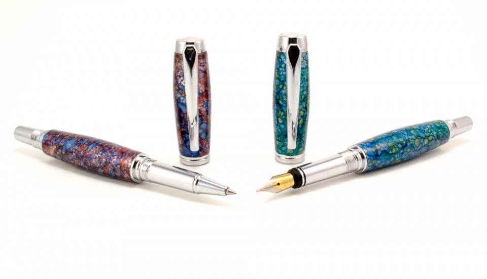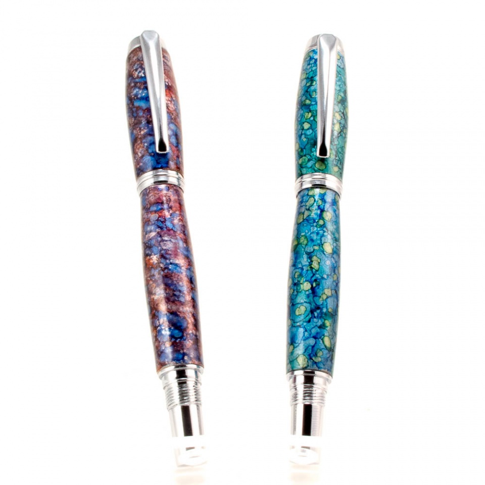 Here are some pics of some recent pens. I made these for some good friends of mine, a married couple. Her favorite color was purple and his was green. I decided i wanted the same look but in different colors. I hand painted these and this is the result. It was a lot of fun making them.