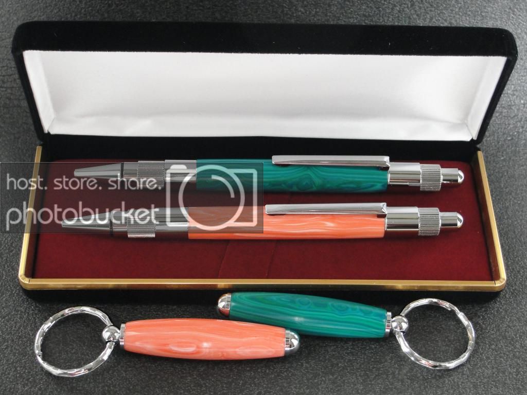 A couple Stratus in trustone. Took a little bit of getting used to writing with these guys. Banded Chrysosolla and Asian Pink Coral. I did the turquoise one 2 weeks go and found it a friend and before I knew it they had 2 kids - boy and a girl :eek:. Looks nice in the case but it wont upload for some reason so a Photobucket upload had to be done. The extra part of the blank went toward 2 key rings. Selling as a set if the time comes.