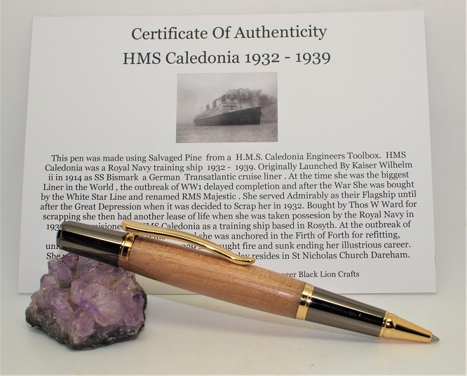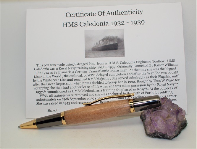 A Sirocco Gold & Gunmetal Pen made using Salvaged Antique pine from an Engineers Toolbox from HMS Caledonia.