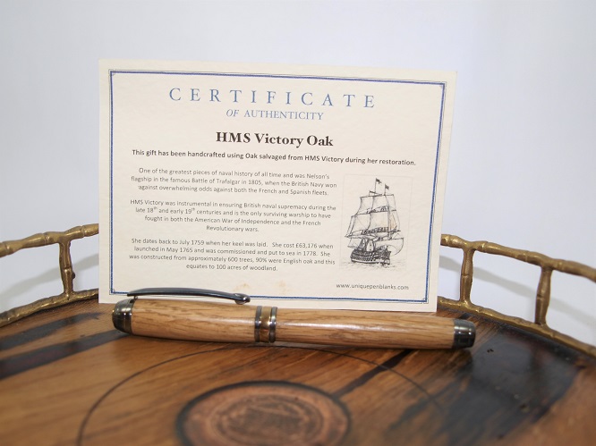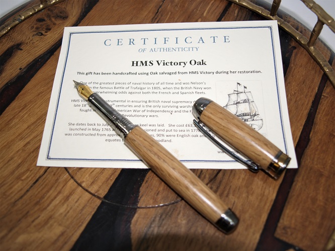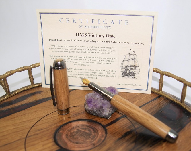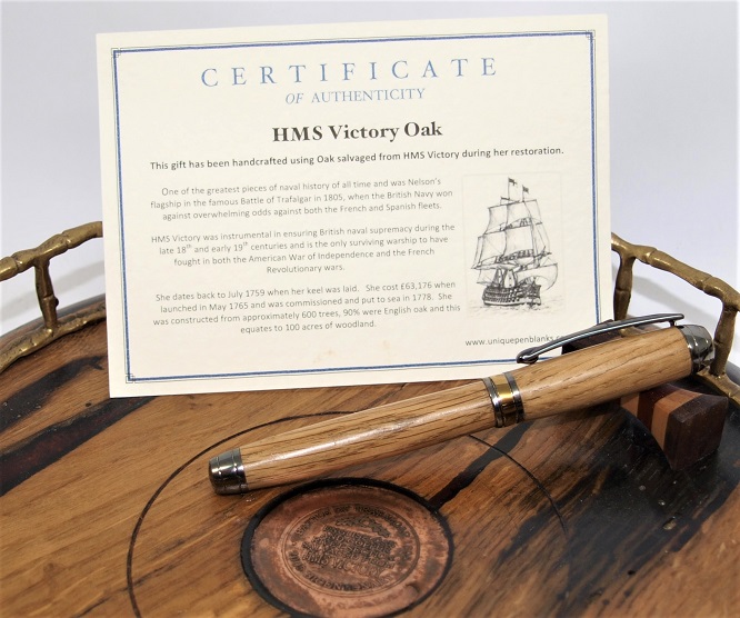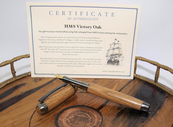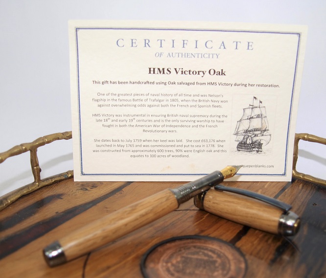 A Black Titanium and Gold plated Fountain pen. Made using genuine HMS Victory Oak with certificate of Authenticity
