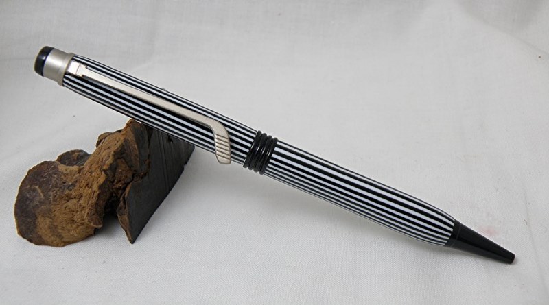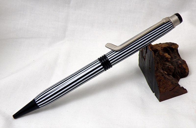 The first is part of a 16 pen order for individualized pens. This one is going to a referee in hockey. The base is a streamline with the black and white stripes. I found another pen with the clip and top barrel that fit a 7mm tube inside it perfectly and stripped it from the pen. The original had a hockey puck on top that I removed and custom turned a black finial.