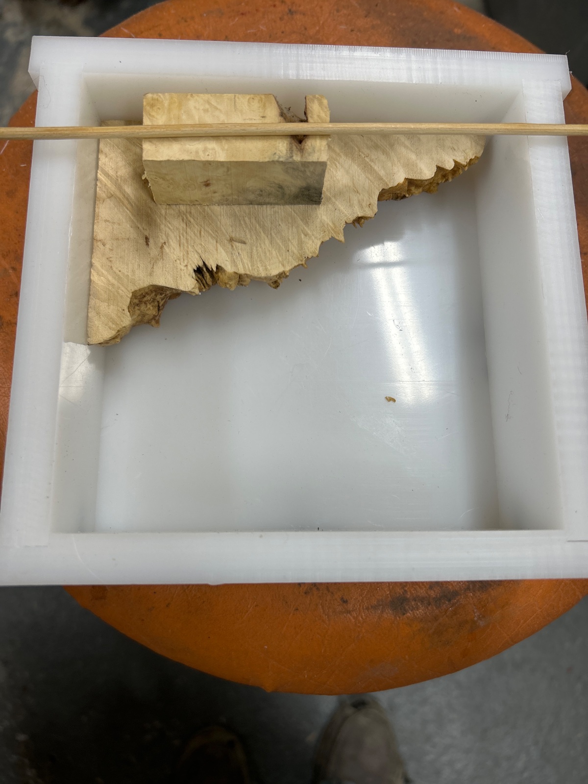 Another option is to use some plastic mesh (something like 1/4" squares, or mesh bags from oranges or other produce) and cut a piece the size of the mold. you can fill the mold, then use large rubber bands to hold the mesh in place along the top of the mold. The mesh will be cut off and disposed of when you demold. You can also pour your resin through the mesh into the mold if that's easier. The mesh can also hold your wood down if it's stiff enough.