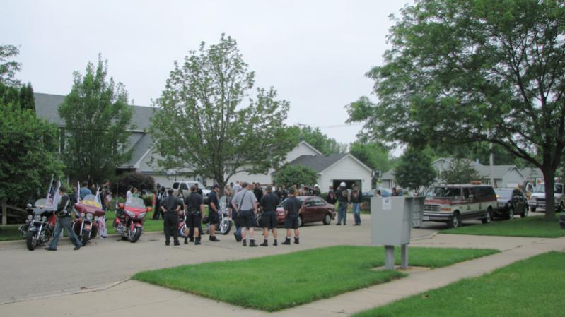 This morning around 7:00am about 30 motorcyclists, 3 fire trucks and several police cars with sirens and lights blaring came to welcome Dave home. It was really touching. He is only 21. attached are a couple of photos of this morning. I hope all the men and women serving realize how much we admire and love them for their dedication!