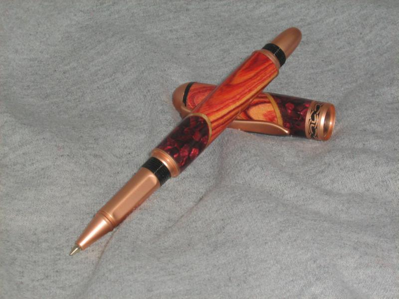 The brushed copper Sadona is Tulip wood. with Invisavue red or maroon. with curly maple inlay.